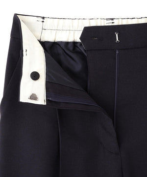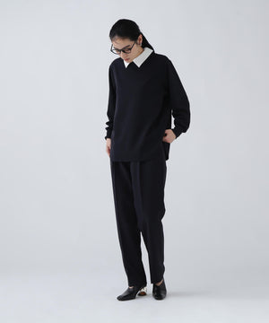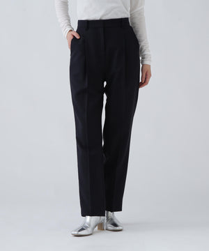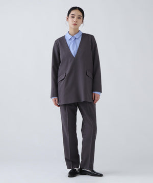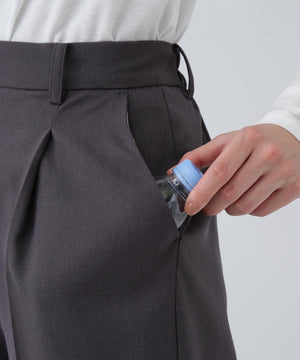 細めの美ストレートシルエットパンツ。後ろウエストはゴム仕様で快適なはき心地です。ペットボトルがすっぽり入るBIGポケット&カードが入るミニポケット付き。同素材のブラウスとのSETUPスタイルもおすすめです。