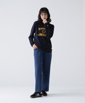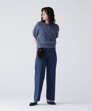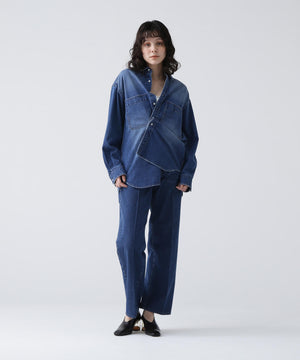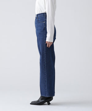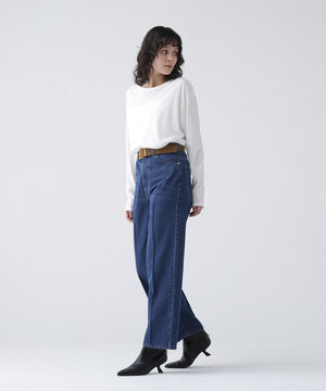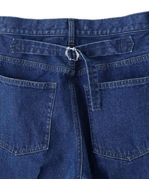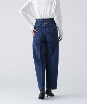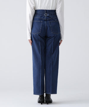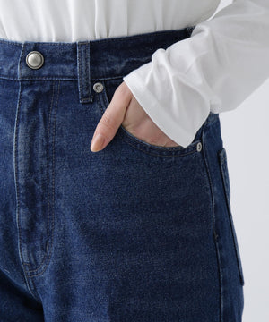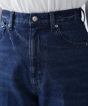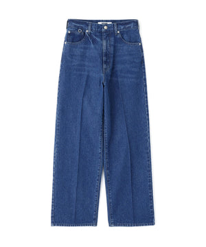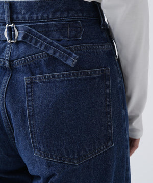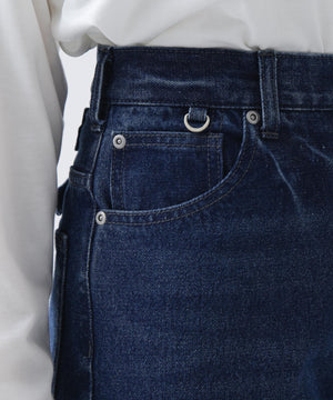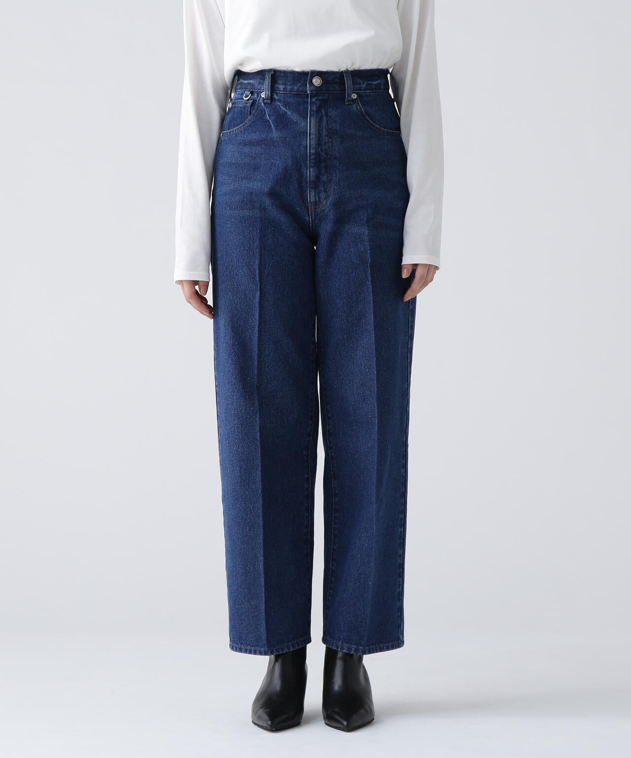 ロングシーズン着られるデニムパンツ。センタープレスが施されたワイドストレートで、すらっとキレイなシルエットを演出します。着脱はボタンと違い、爪にやさしい前カン仕様でスムーズな使い心地。右ポケットにはDカンフック付きで小物もオシャレに携帯できます。