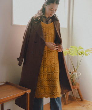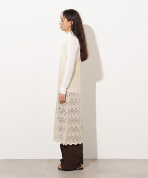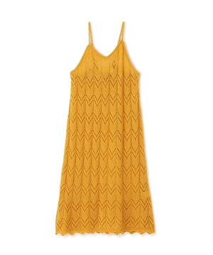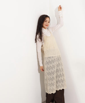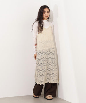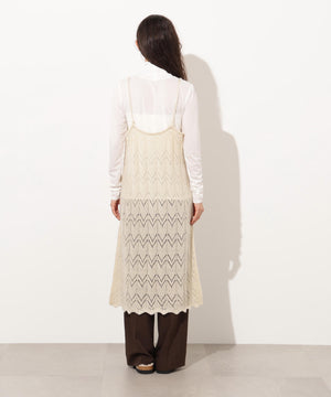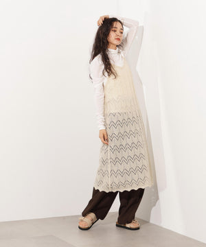 クラフト感のある透かし編みが印象的なニットキャミワンピース。Iラインシルエットでスタイルアップが叶います。中にTシャツやニット、カットソーとのレイヤードスタイルに活躍。パンツ合わせで旬なレイヤードが叶います。