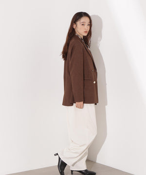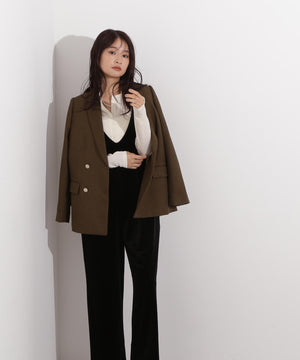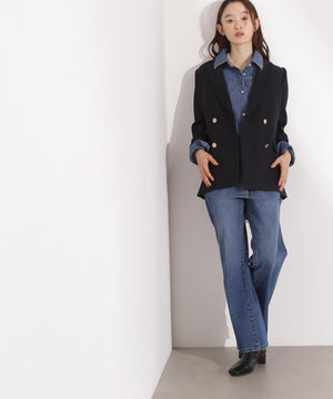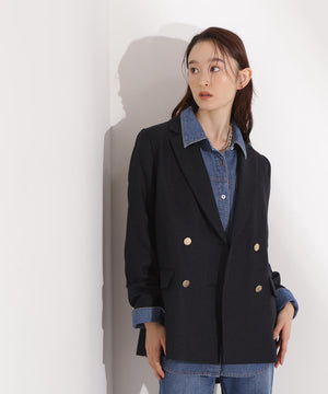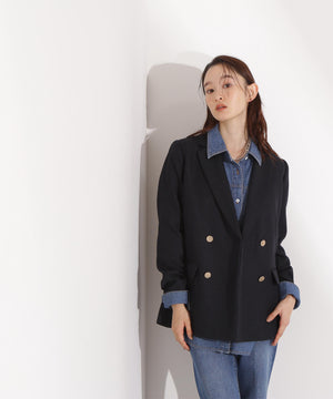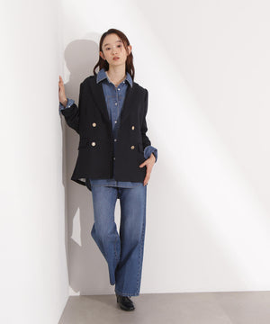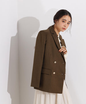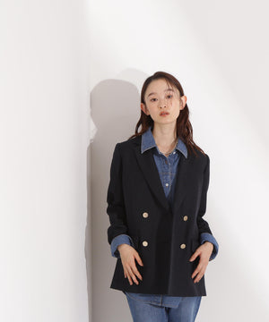 セットインスリーブでONでもOFFスタイルでも合わせやすいサイズのダブルブレストジャケット。トレンド感のあるボクシーシルエットに、フロントと袖口にあしらったゴールドカラーの釦がポイントになります。ワンピース、パンツ、スカートも合わせやすい丈感で、カジュアルにもきれいめにも着こなせる1着です。袖裏はストライプ生地を使用、袖口を折り返してストライプ柄をさり気なく見せるのもおすすめ。