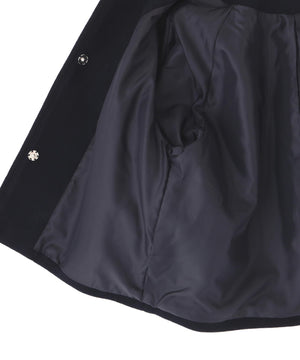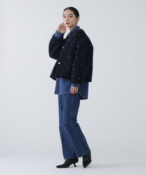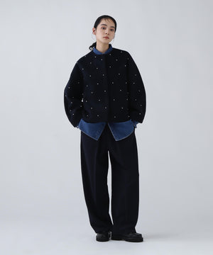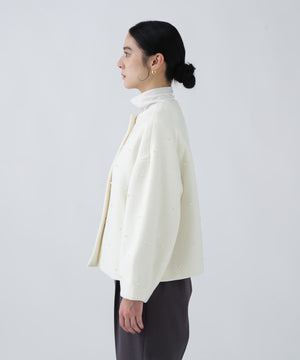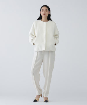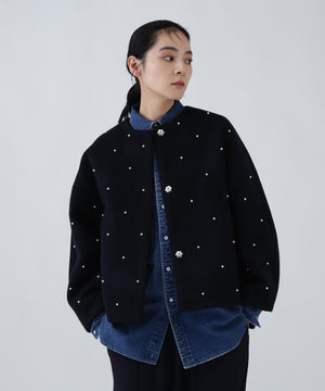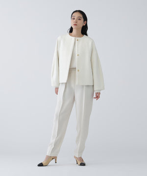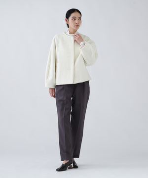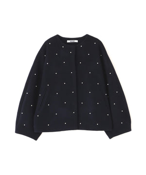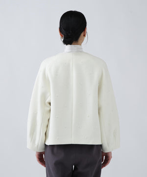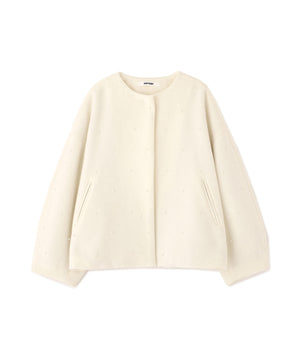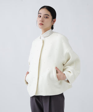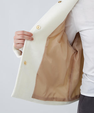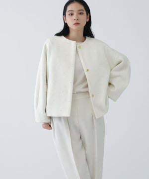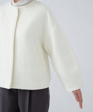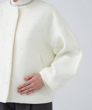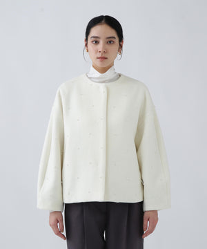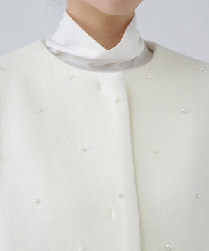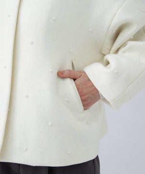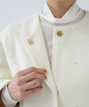 アクセサリーがなくても瞬時に華やぎをプラスするパール付きデザインのショートコート。襟はノーカラーですっきりと、ONにもOFFスタイルにもシーンを選ばずに活躍してくれます。パールのディテールが映え、コーディネートに取り入れるだけで気分が高まる1着です。