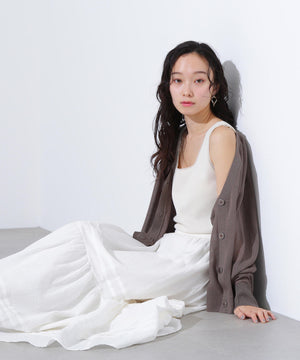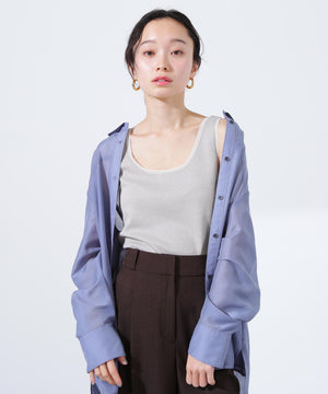 ヘルシーさを叶えるシアートリムタンクトップ。襟とアームホールにシアー素材をトリミングした、軽やかなデザイン。シンプルなネックラインで、デコルテを綺麗に見せてくれます。これからの季節、シアーシャツを羽織ったり、ジャケットインするのも大人っぽく着こなせるのでお勧めです。