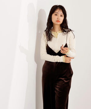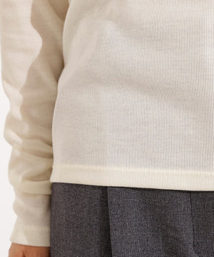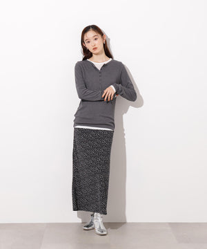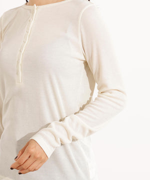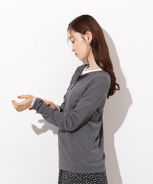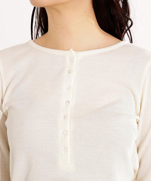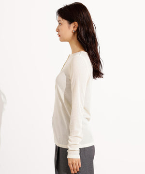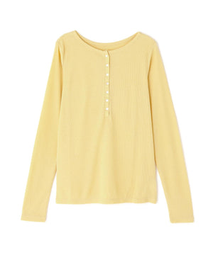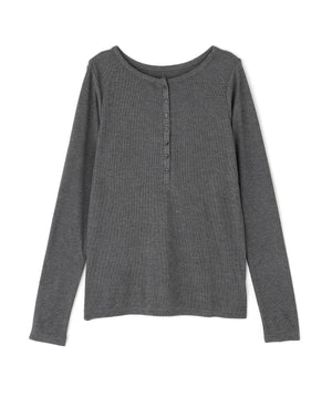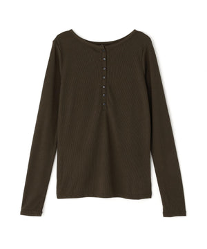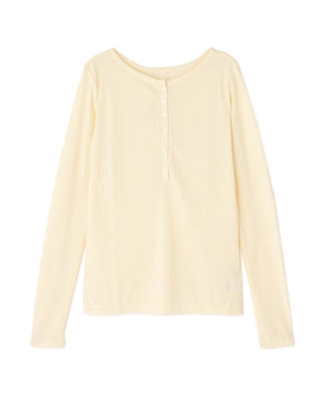 ほんのり透け感のあるリブカットソー素材を使用した、ニュアンスのあるヘンリーネックカットソー。華奢な前立てとボタン、少し大きく開けた胸元など、カジュアルなアイテムを女性らしく仕上げています。色違いで二枚重ねたり、ロンTとのレイヤードスタイルにもおすすめです。