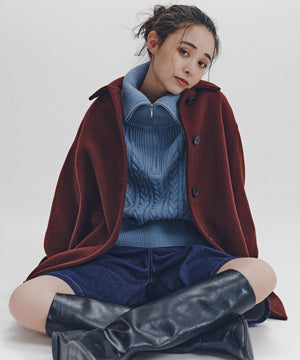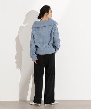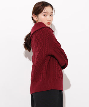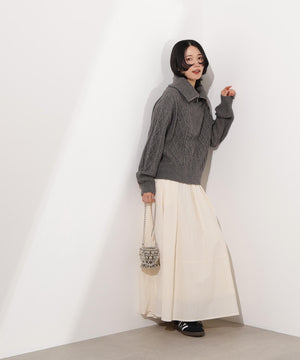 ざっくりとした糸を使用したケーブル編みがカジュアルな雰囲気のニット。ビッグカラーで顔まわりを華やかに見せながら、ハーフZIP付きで抜け感も演出します。中にシャツを着てレイヤードしたり、1枚着としても着回せるデザインです。スカートもパンツも合わせやすく、ボトムスを選ばずに着ていただけます。