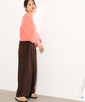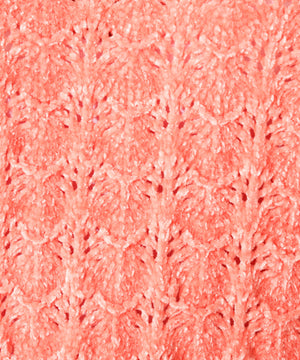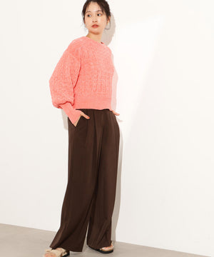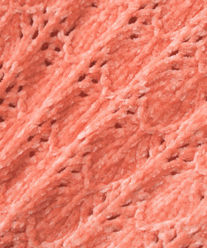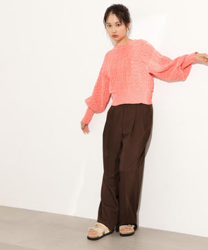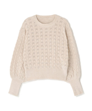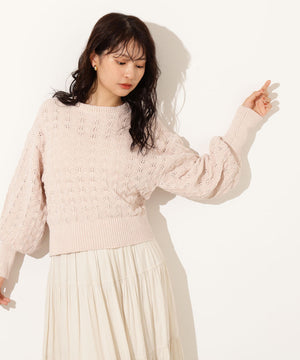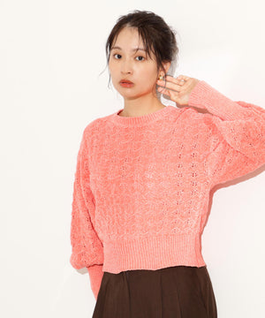 トレンド感のあるモール糸を使用した柄編みニット。コンパクトなシルエットながら、袖口のリブ使いでふんわりとしたボリューム袖が映えるデザイン。柔らかい風合いなので着心地が良く、華奢見えを叶えるバランス感も魅力。透け感のある柄編みのためお持ちのインナーをご着用ください。コーディネートに取り入れるだけで旬なスタイリングが完成します。