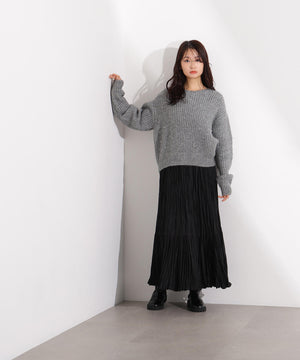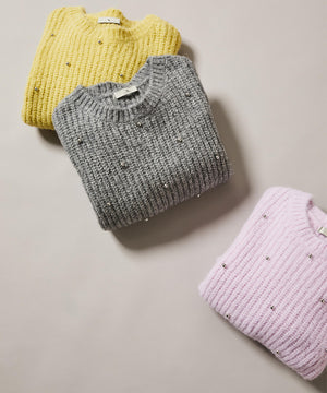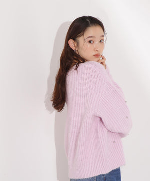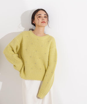 スタッズをあしらったデザインがポイントの畔編みコンパクトニット。ふんわりとした風合いで、カジュアルスタイルに程よい華やかさをプラスします。コンパクトなシルエットなのでボトムスとバランスが取りやすいデザインです。