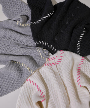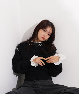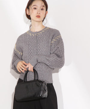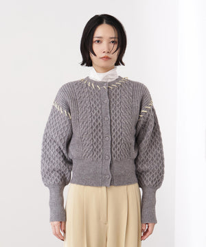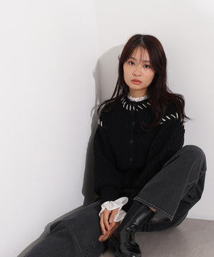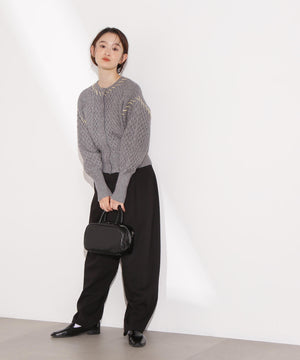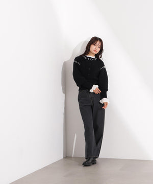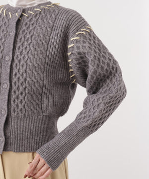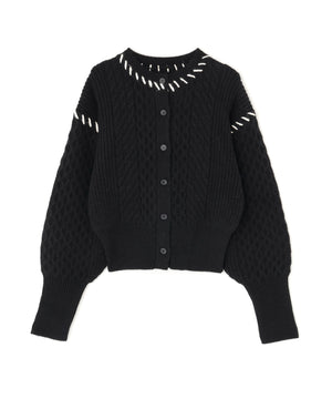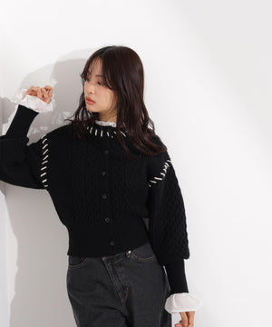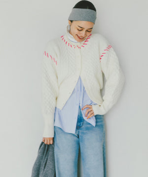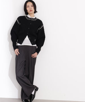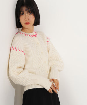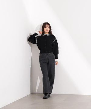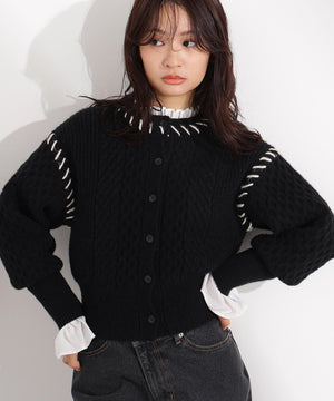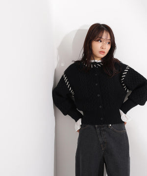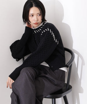 バイカラーステッチがアクセントになったケーブル編みのコンパクトカーディガン。配色ステッチがスタイリングのポイントになり、シンプルコーデも華やかに見せてくれます。ボタンを留めてプルオーバー風にも着こなせるデザイン。コンパクトなシルエットなので、ワイドパンツやフレアスカートとも相性バツグンです。