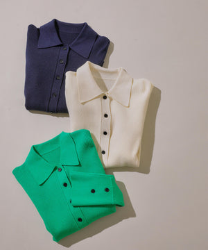ポロ襟デザインにフレアカフスを取り入れたトレンド感あるニット。昨年人気のデザインをベースに、着丈を伸ばしてアップデートしました。バイカラーボタンがアクセントになり、シンプルながら華やかな印象に見せてくれます。身頃はベーシックなサイズ感で、すっきりとしたシルエット。デイリースタイルに着回せるデザインです。