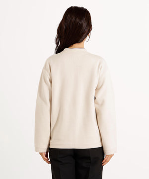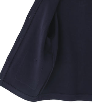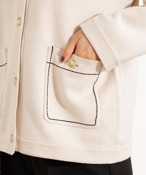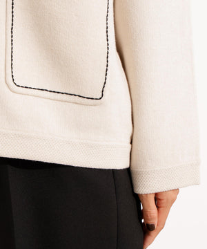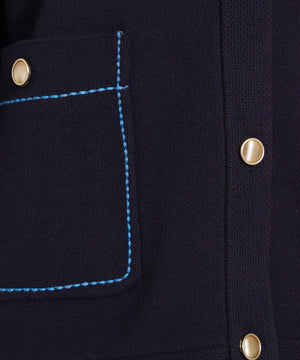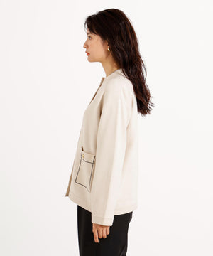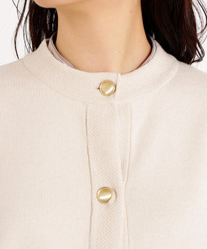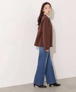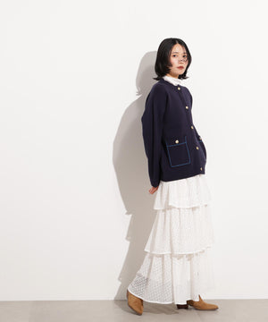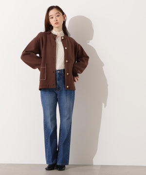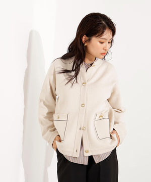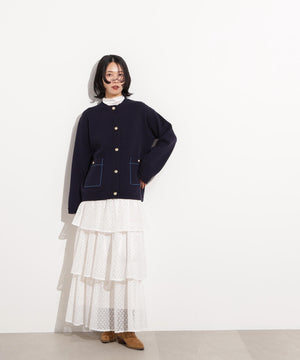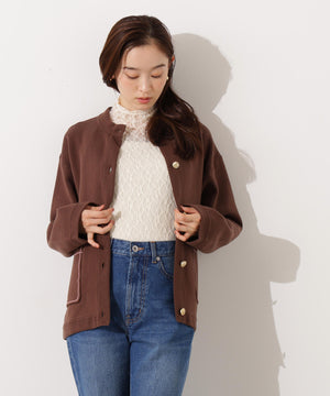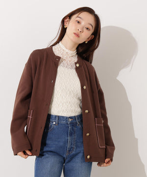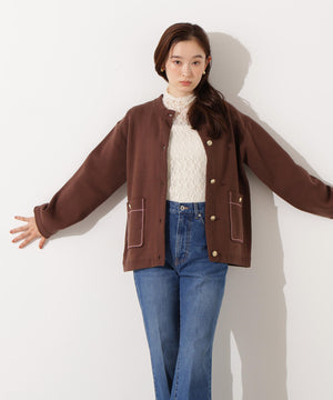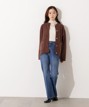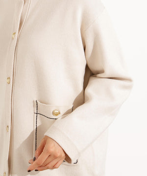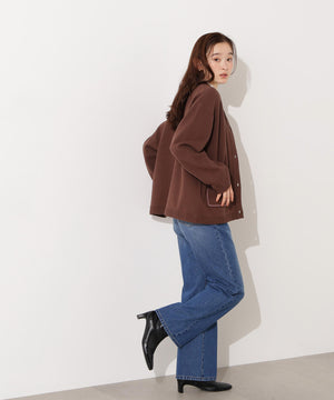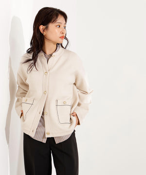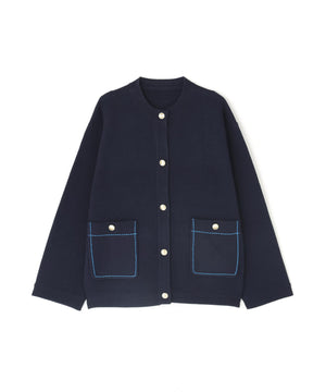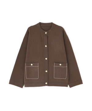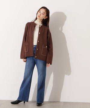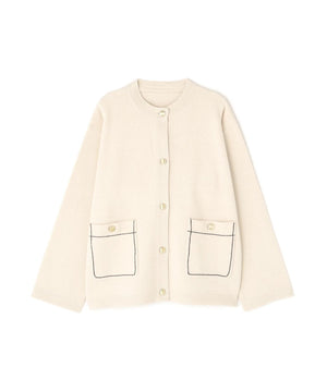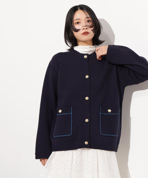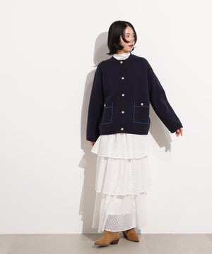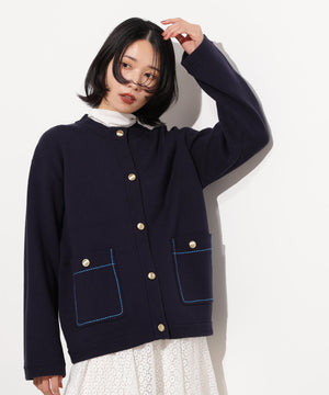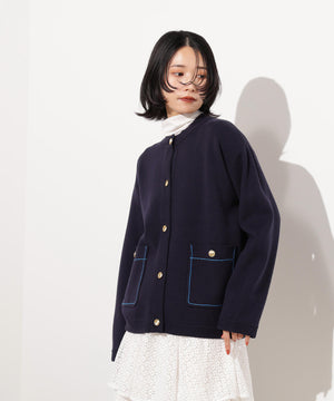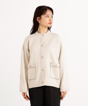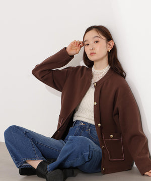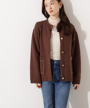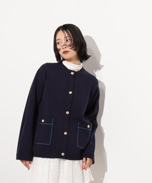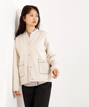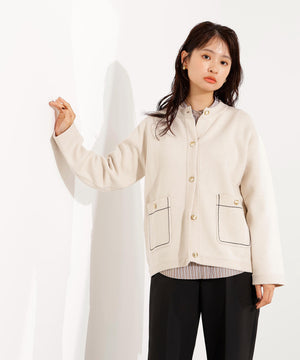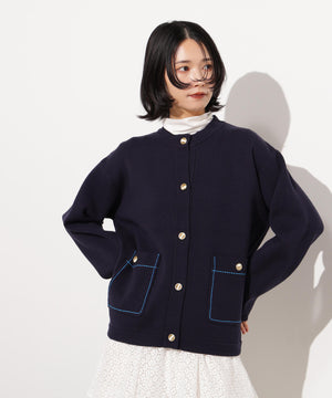 大きめのポケットと配色ステッチがポイントのニットジャケット。秋は羽織りとして、冬はコートインにも着回せるので、長く活躍できます。スカートでもパンツでも合わせやすいミドル丈のシルエットです。