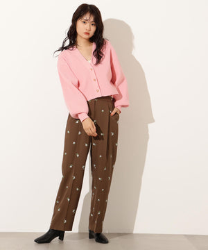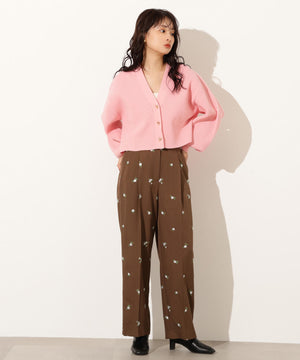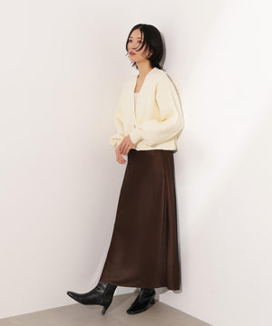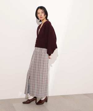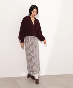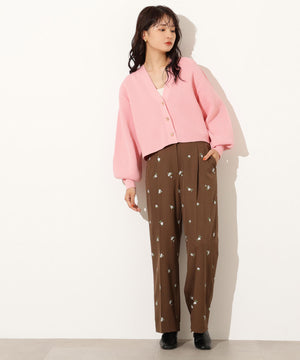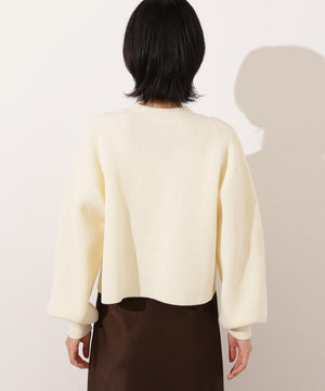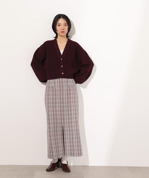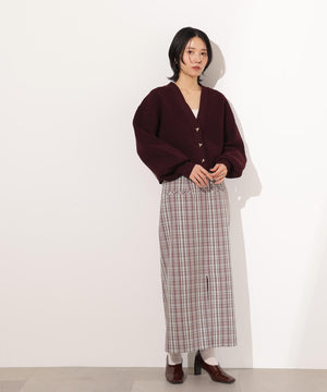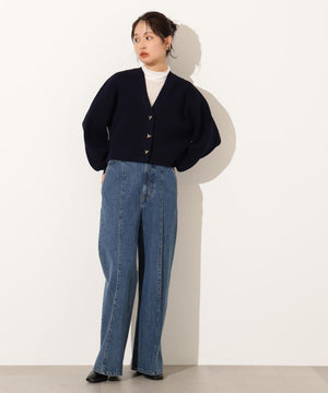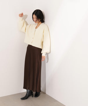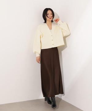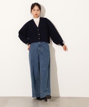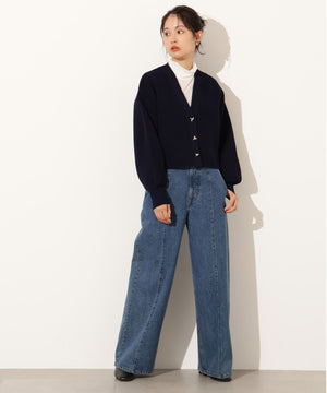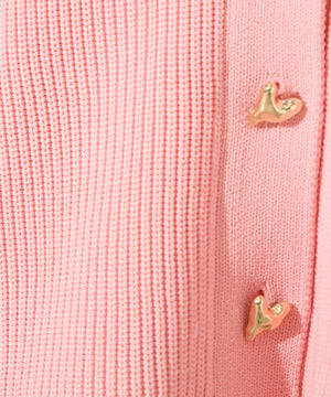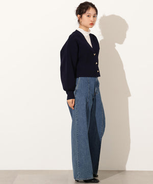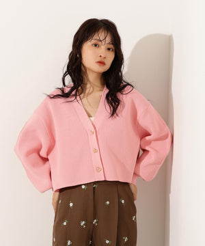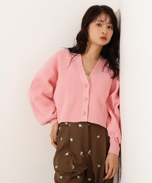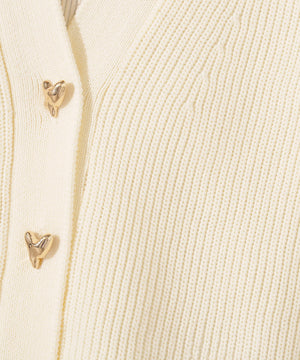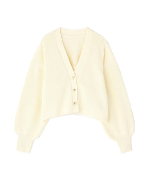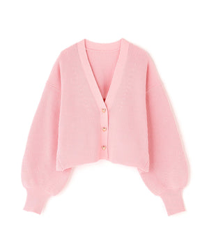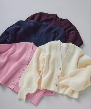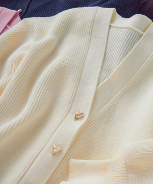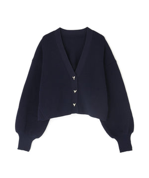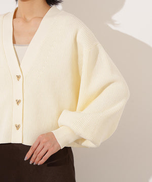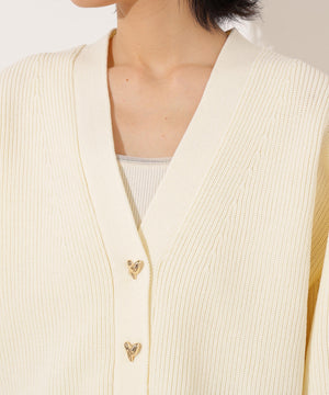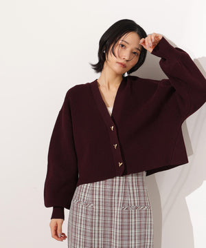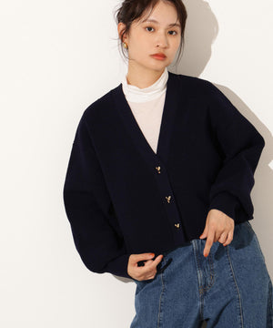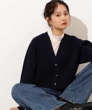 ハート型ボタンが愛らしいショート丈のVネックニットカーディガン。さらっとした軽い着心地です。ボクシーシルエットとコンパクトな着丈で、ボトムスを選ばず着ていただけます。