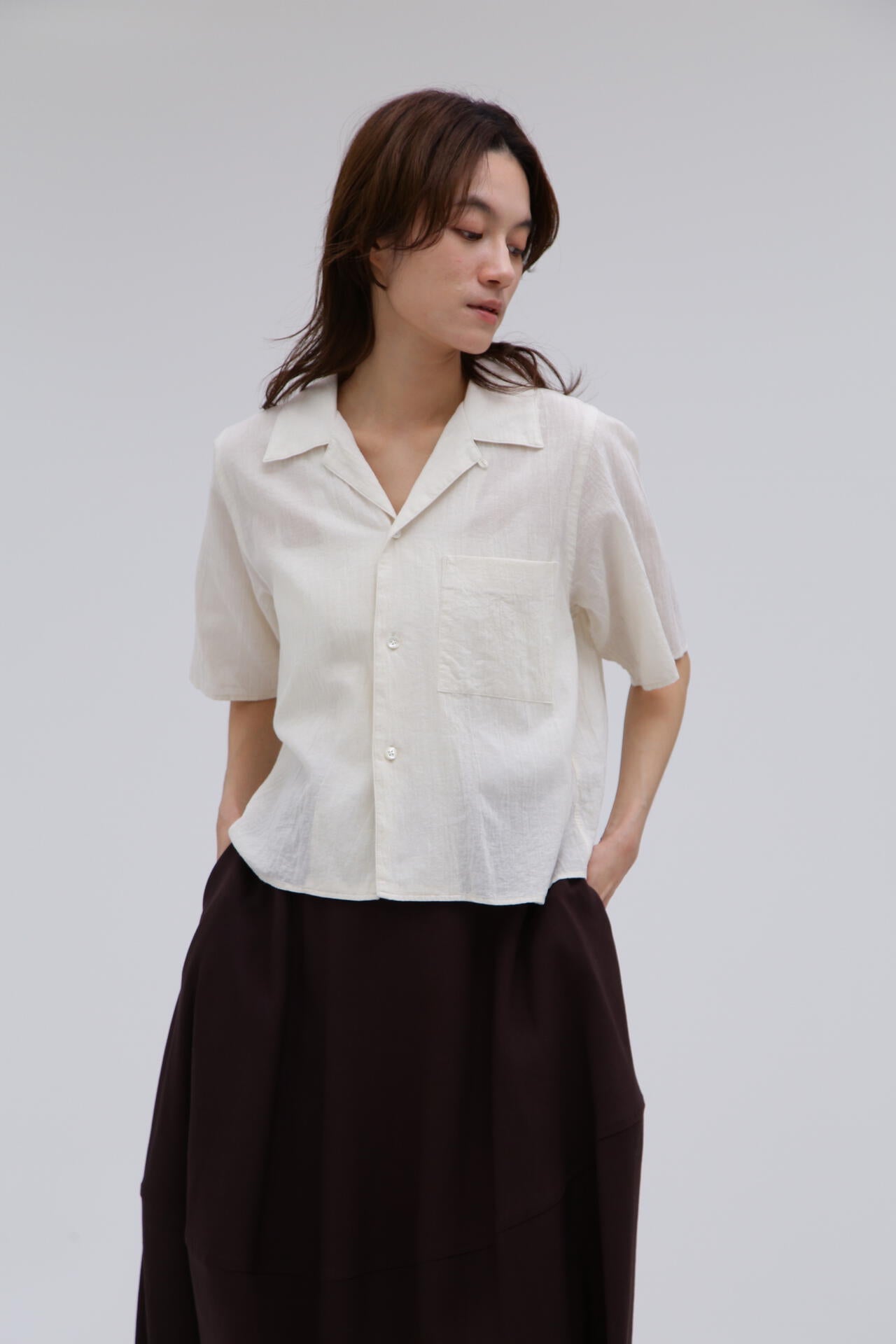 コットンと柔らかさとリネンのさらっとした肌触りを活かしたオープンカラーのシャツ。程よくゆとりのあるシルエットと素材の風合いが相まったリラックス感のあるアイテム。