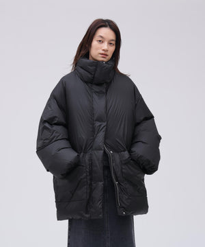 羽のように軽量なフェザーライトナイロンを使用したダウンジャケット。1930年代に登場したパファーシルエットを現代的に再解釈。高めのファンネルネックと調整可能なドローコード付きの裾が保温に特化。
