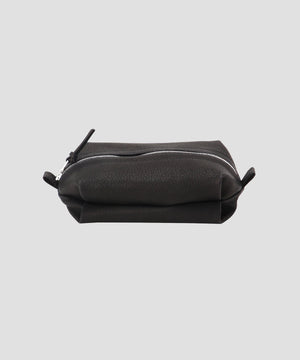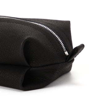 シボ感のある鹿革を用いたポーチ。開閉はファスナー仕様で、タックや切り替えが独特なフォルムを表現。コスメやステーショナリーなどの必需品を収納できる。