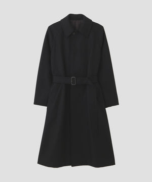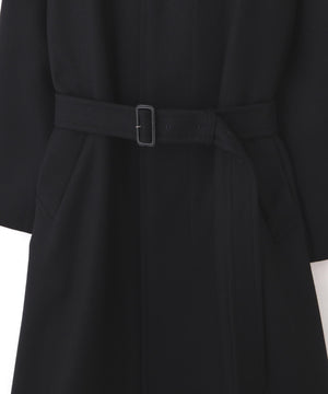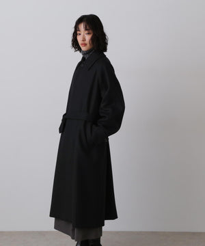 SUPER100'S原料を使い高密度に織り上げた梳毛ダブルクロスです。厚みを抑え高密度に織り、抗ピリング加工を行っています。チンタブ付きのゆったりしたロングコートです。