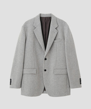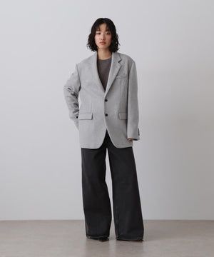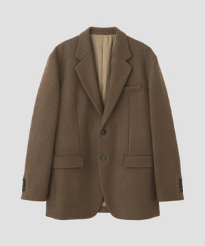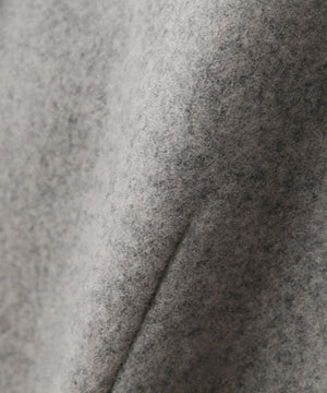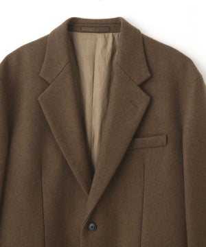ノンミュールジングの梳毛原料の羊毛を紡毛引きした糸を使用しています。粗目の梳毛原料を使うことで、少しラフな見え方の中にハード過ぎない柔らかさを兼ね備えています。TOP染めした生地からオーバーダイすることで独特なメランジ感を表現。アウター代わりになるゆったりしたシルエットのテーラードジャケットです。