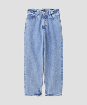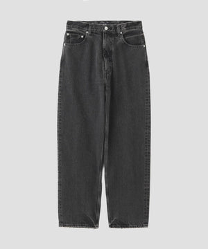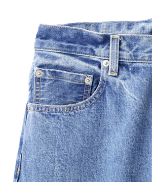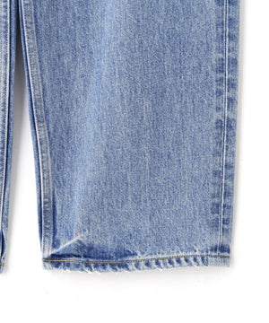 オリジナルの13.5ozデニムは、旧力織機で織られた白耳のセルビッチデニム。隠しリベットや渡り閂、環縫いなど本格的なデニム仕様。フェイド加工は職人の手によって1本ずつ加工を施されたこだわりの加工です。加工している為生地の特性上斜行があります。#020は経糸、横糸ともに硫化ブラックで染め、製品洗い加工の負担を低減した新しい技術を採用。#110は、水を40%、化学薬品を50%削減したサスティナブルな染色。ゆったりとしたバギーシルエット。シルエットの関係で外脇はロック始末です。