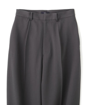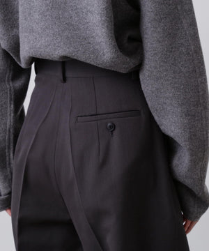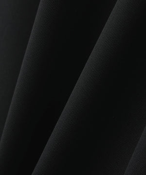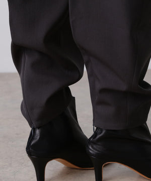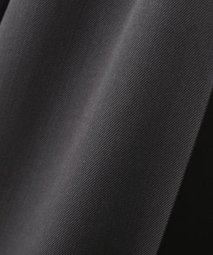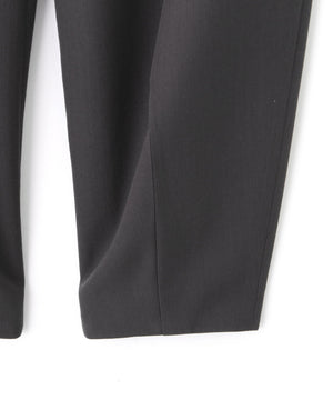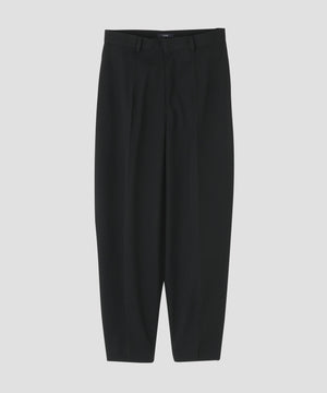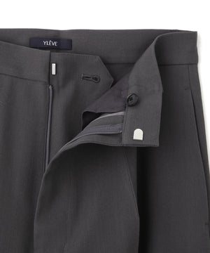 梳毛ウールのツイルを加工によって張り感ある風合いに仕上げています。前後左右、カーブシルエットに仕上げたテーパードパンツ。裾幅が細いので後ろダーツにファスナー付きになります。
