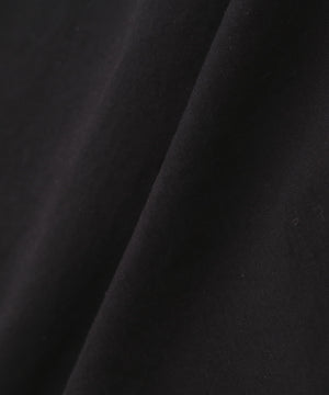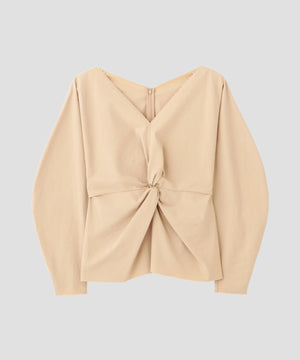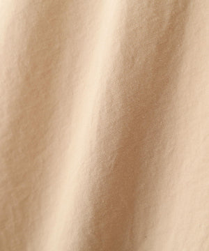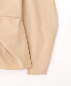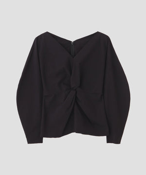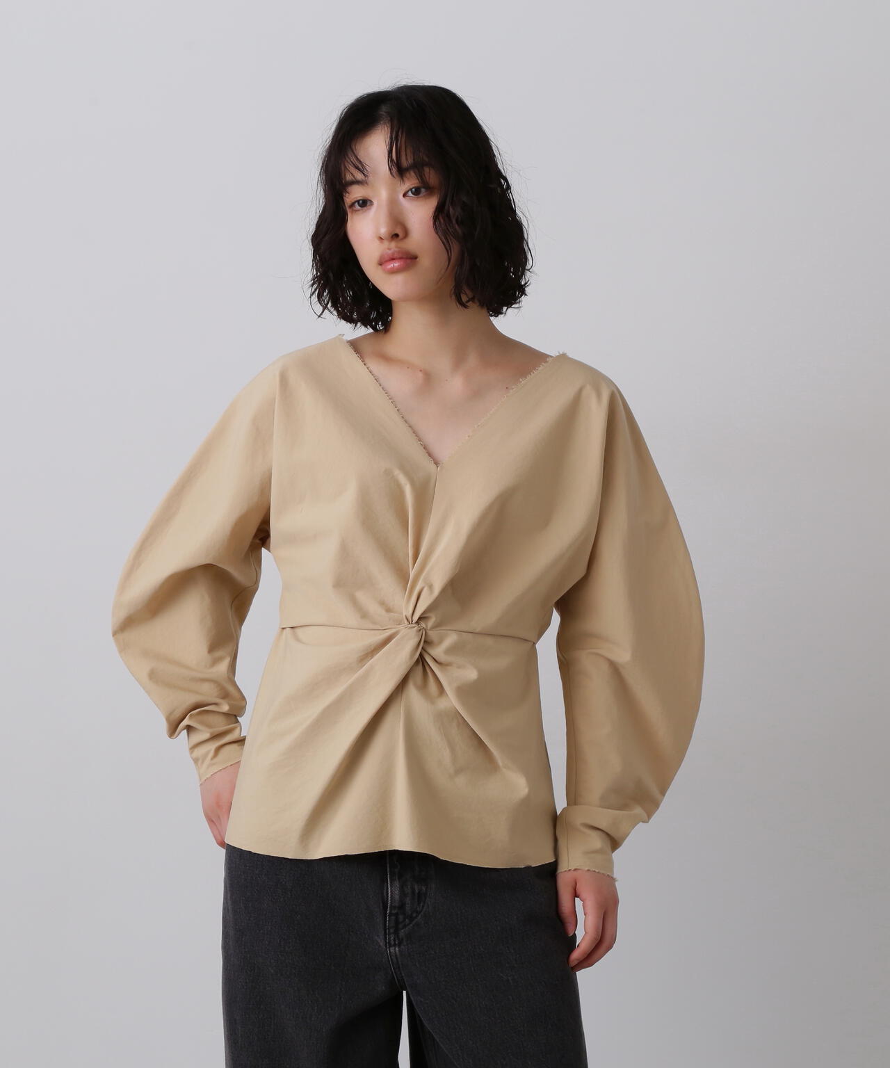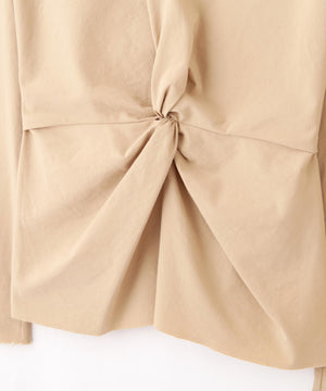 特殊な加工によって綿本来の質感を残しつつ、張り感のあるヴィンテージのようななれた風合いの素材です。フロントのツイストデザインとドルマンスリーブはたくし上げるとバルーンスリーブのシルエットを作ります。