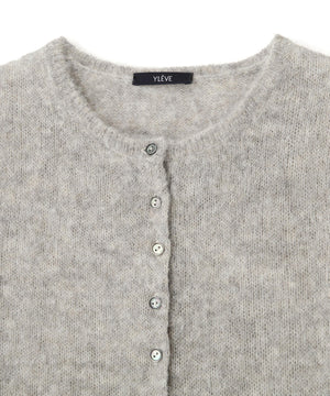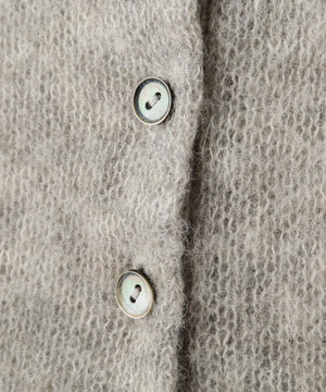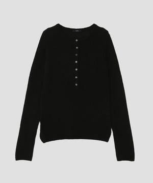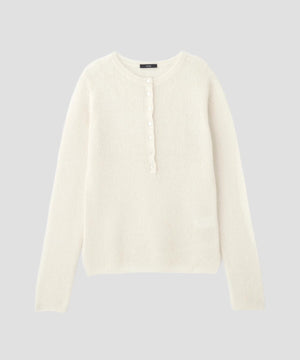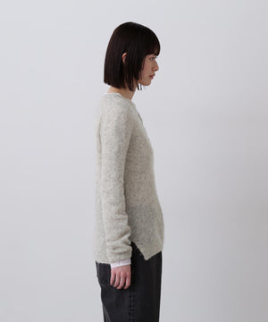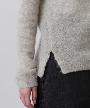 アルパカを使用した柔らかくヘアリーな素材です。軽くふんわりとした編み地のヘンリーネックプルオーバーです。