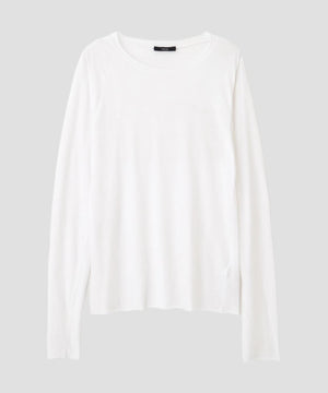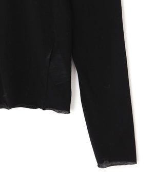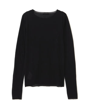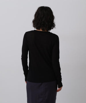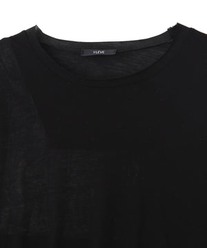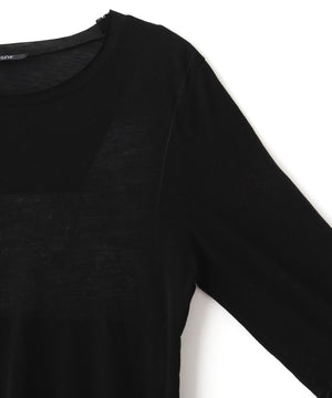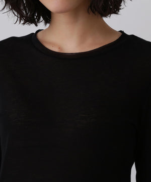 スーピマ原綿の強撚糸をガス焼きして毛羽を極限に少なくしたハイゲージ天竺です。バイオ加工も施し、クリアで落ち感のある仕上がりです。襟ぐり、袖口、裾が断ち切り始末の透け感あるカットソーは、ヘンリーニットなどのレイヤードに好相性です。