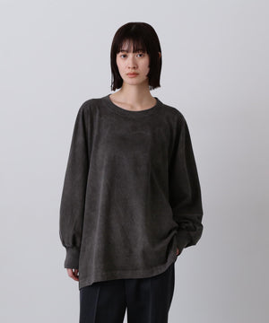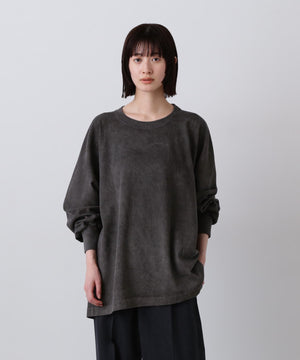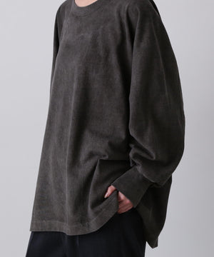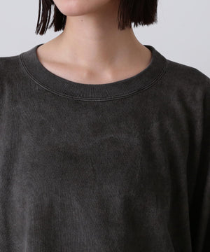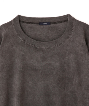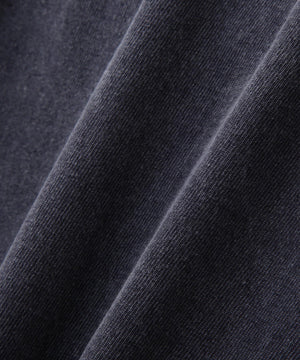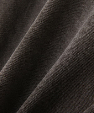 生地は着るほどに味がでる空紡糸を使用しており、さらに製品で顔料染め加工を施すことでムラ感がある染まり具合が特徴です。ジャストサイズのラウンドヘムのカットソーです。