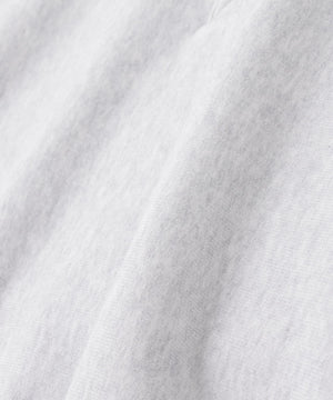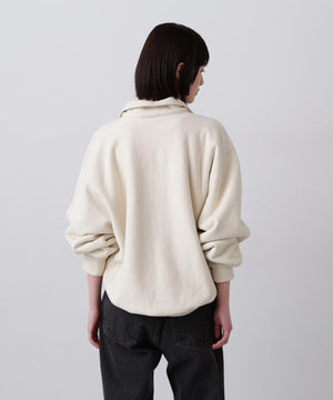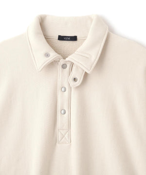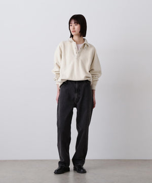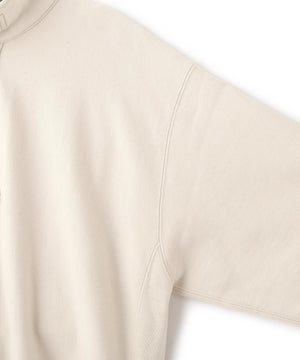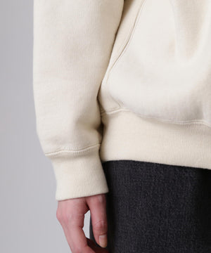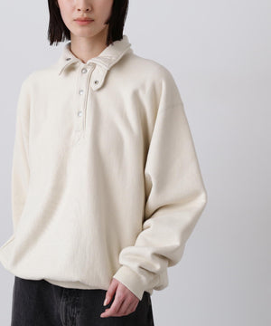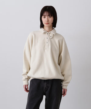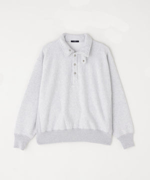 しっかり目が詰まった裏毛に、ヘザーは生地でブリーチを入れて通常の色展開にはない薄いトップグレーを。チャコールは製品でブリーチ加工を入れて古着っぽいイメージで仕上げました。スナップボタン仕様の襟付きプルオーバーです。