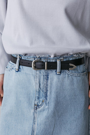 ヌメ革のベジタブルタンニンのシュリンクレザーを使用したウェスタンベルトは、ウールトラウザースにも合わせられる上品な仕上がりです。