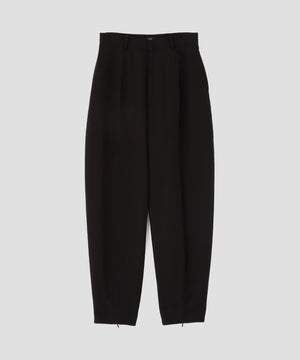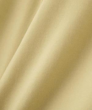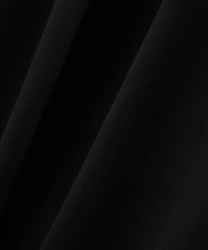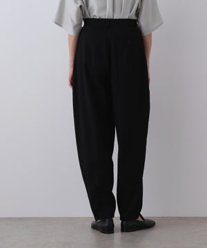 経緯にガス焼きしたボイル糸を使用することで、サマーウールのような上品な清涼感を実現。あえてシルケット加工を施さず、ワッシャー加工をかけることで、マットで自然な風合いに仕上げました。前後左右にわたってカーブを描くような立体的なシルエットのテーパードパンツ。裾幅を細く設定しており、着脱をスムーズにするために後ろダーツ部分にファスナーを配置しています。