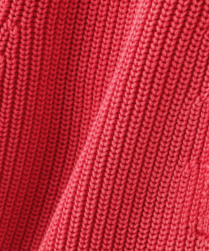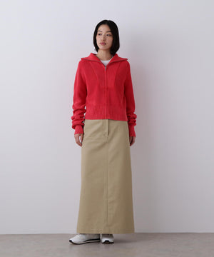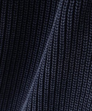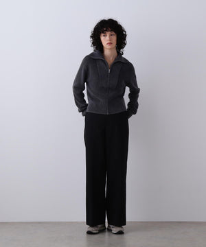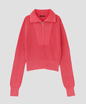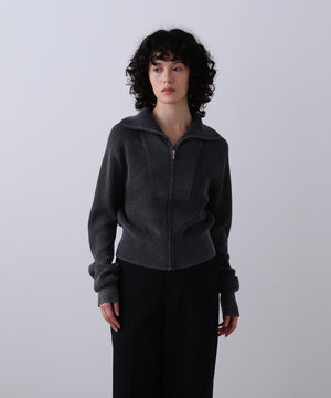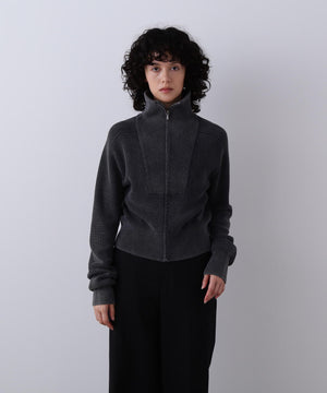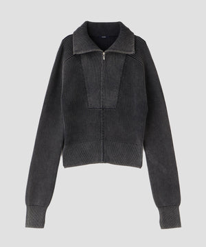 40/2コットン糸を高密度に編み立て、製品染めとストーンウォッシュ加工を施すことで、サンフェード感のある風合いに仕上げたニットです。ジャストフィットのシルエットに、大きめの襟を配したフルジップデザインが特徴です。