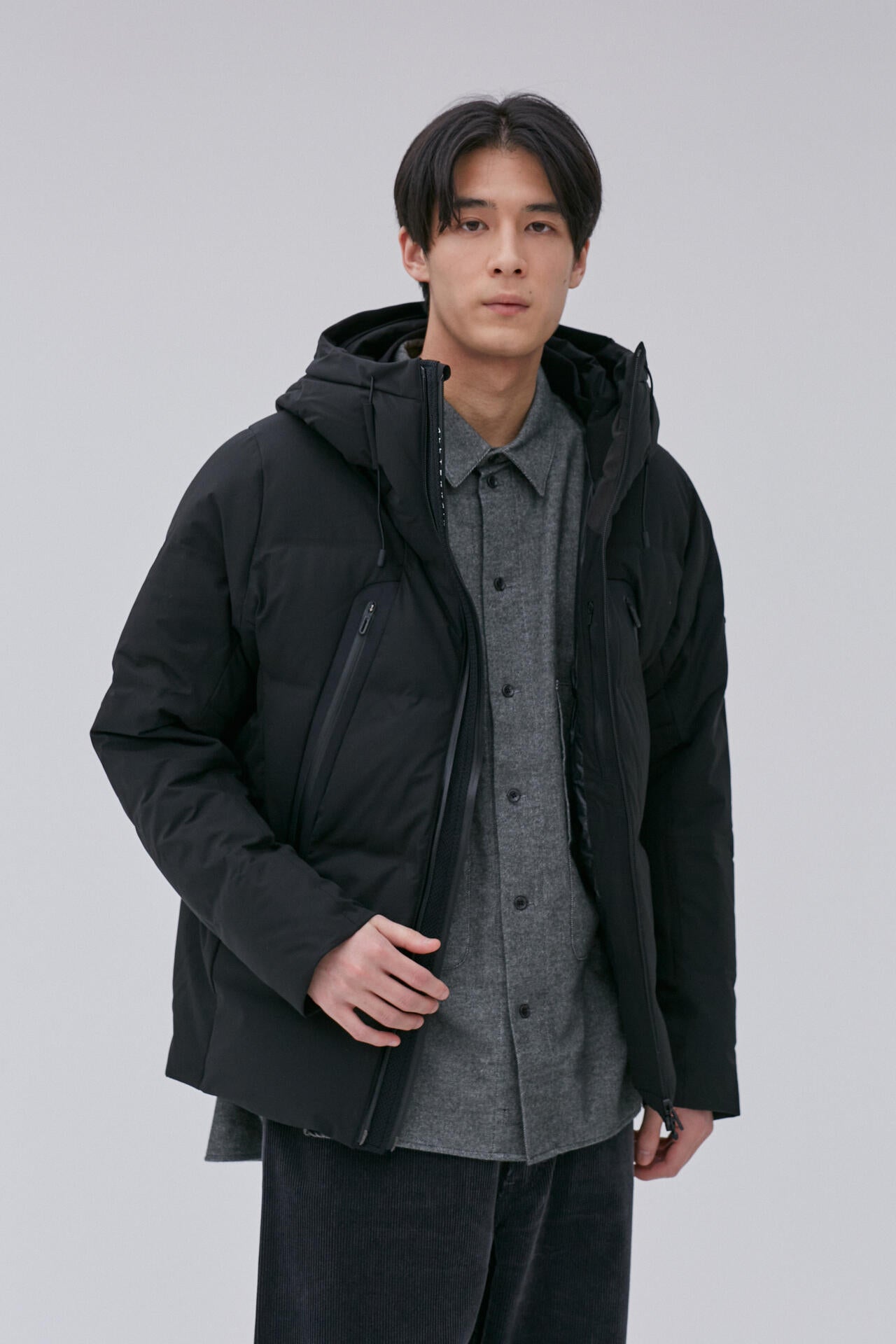 熱接着ノンキルト加工とシームテープ加工による高い耐水性はそのままに、2023年モデルからディテールを見直し、より快適で利便性の高い仕様にアップデート。両胸の内側にポケットを追加し、取り外し式のキーチェーンを追加して収納性を向上。袖口や内襟仕様も変更してより肌触りのよい素材を採用。またフードをコンパクトに収納するだけでなく、雨などの悪天候下での着用も考慮しフードへの水たまりを防ぐパラフードシステムを採用。フロントジッパー部分に採用されたデュアルジップベンチレーションは、2列のジッパーとその間に配置されたメッシュ生地により衣服内に外気を取り込み、ジャケット内にこもりやすい不快な熱や湿気を逃がすことが可能。裏地には保温素材HEAT NAVI#174; を使用し、衣服内を快適な温度にキープ。さらに「DOWNPASS」認証を取得したトレーサブルダウンを使用しシリアルナンバーによる厳正な管理を行うことで全ての羽毛の調達過程を追跡することが可能。