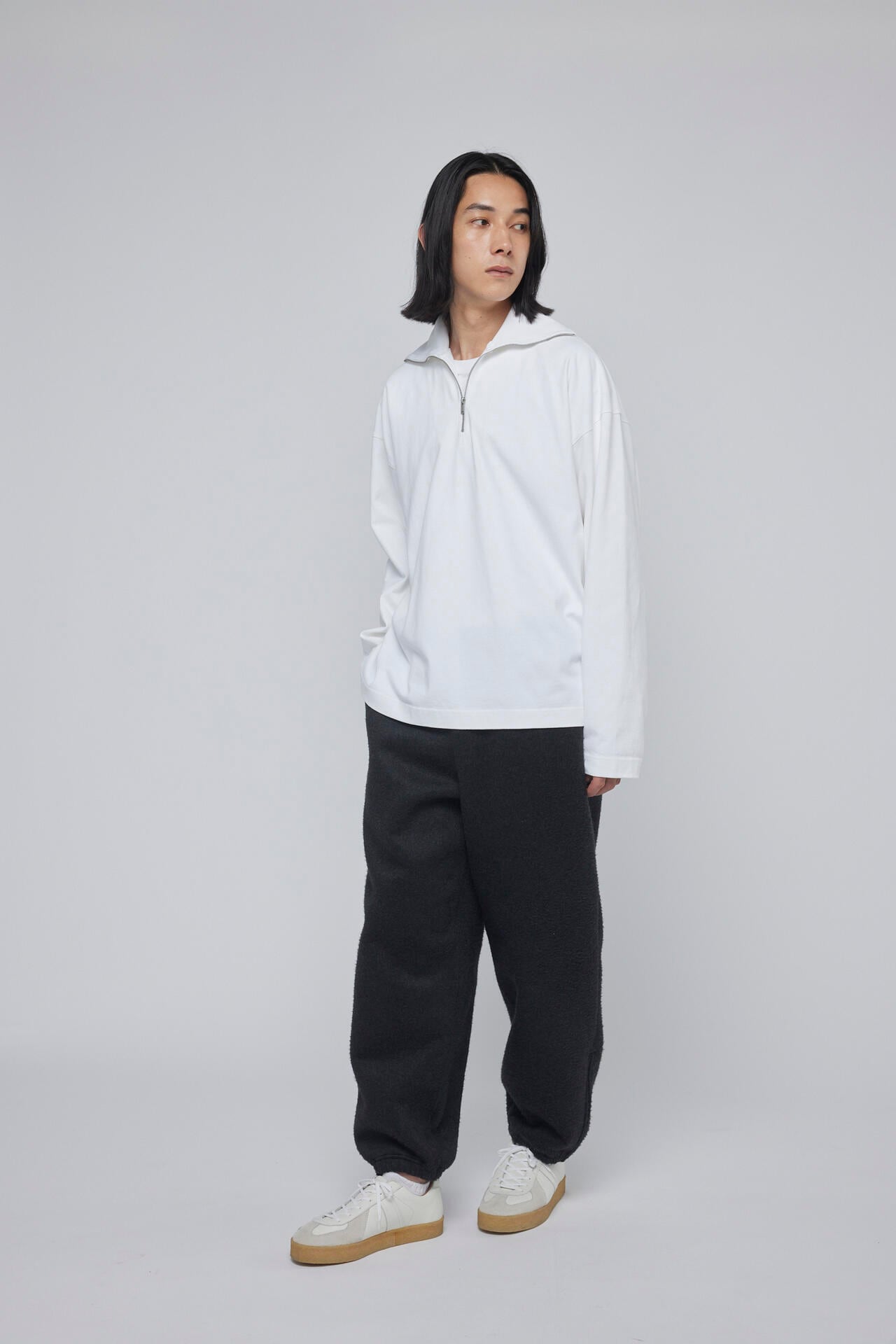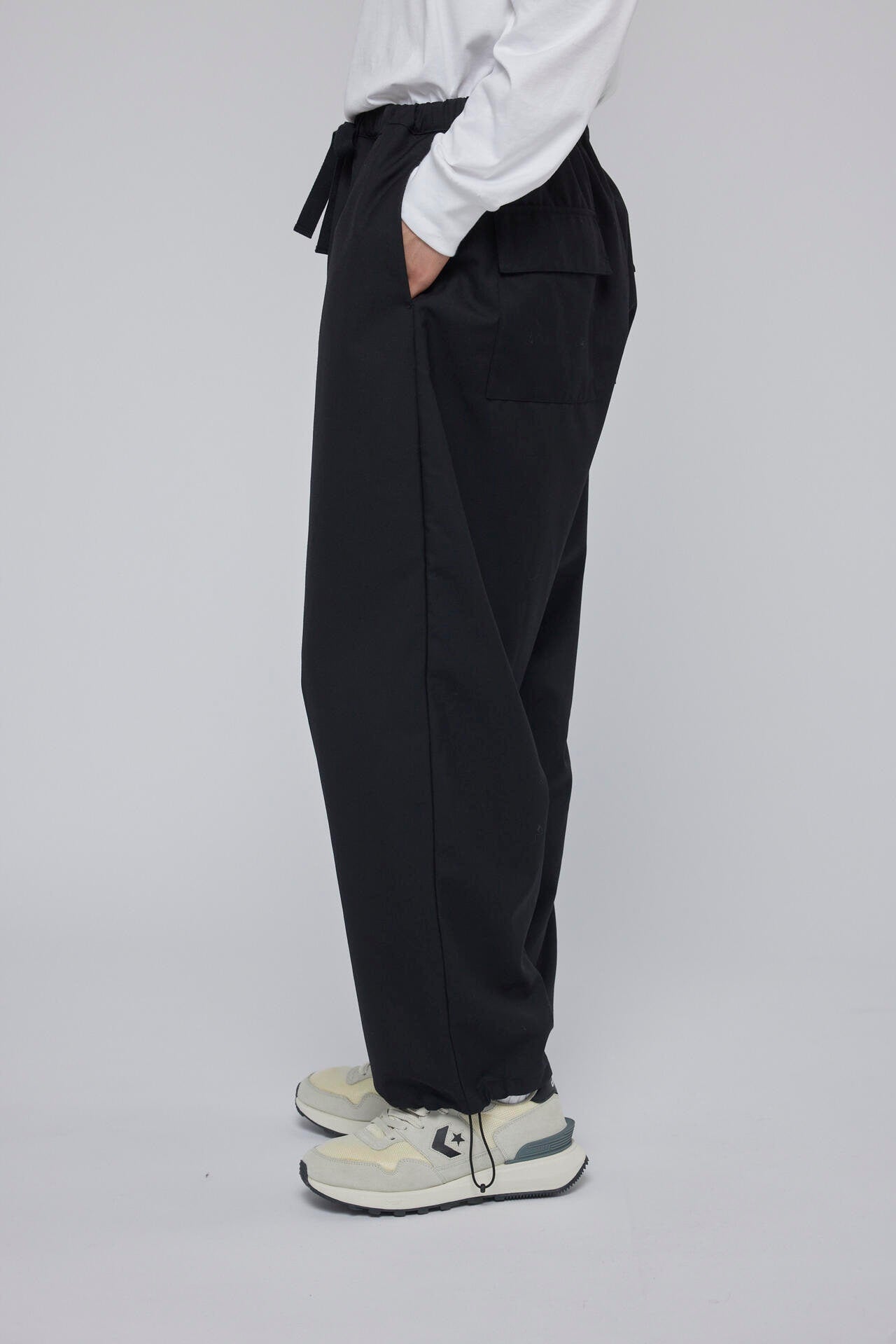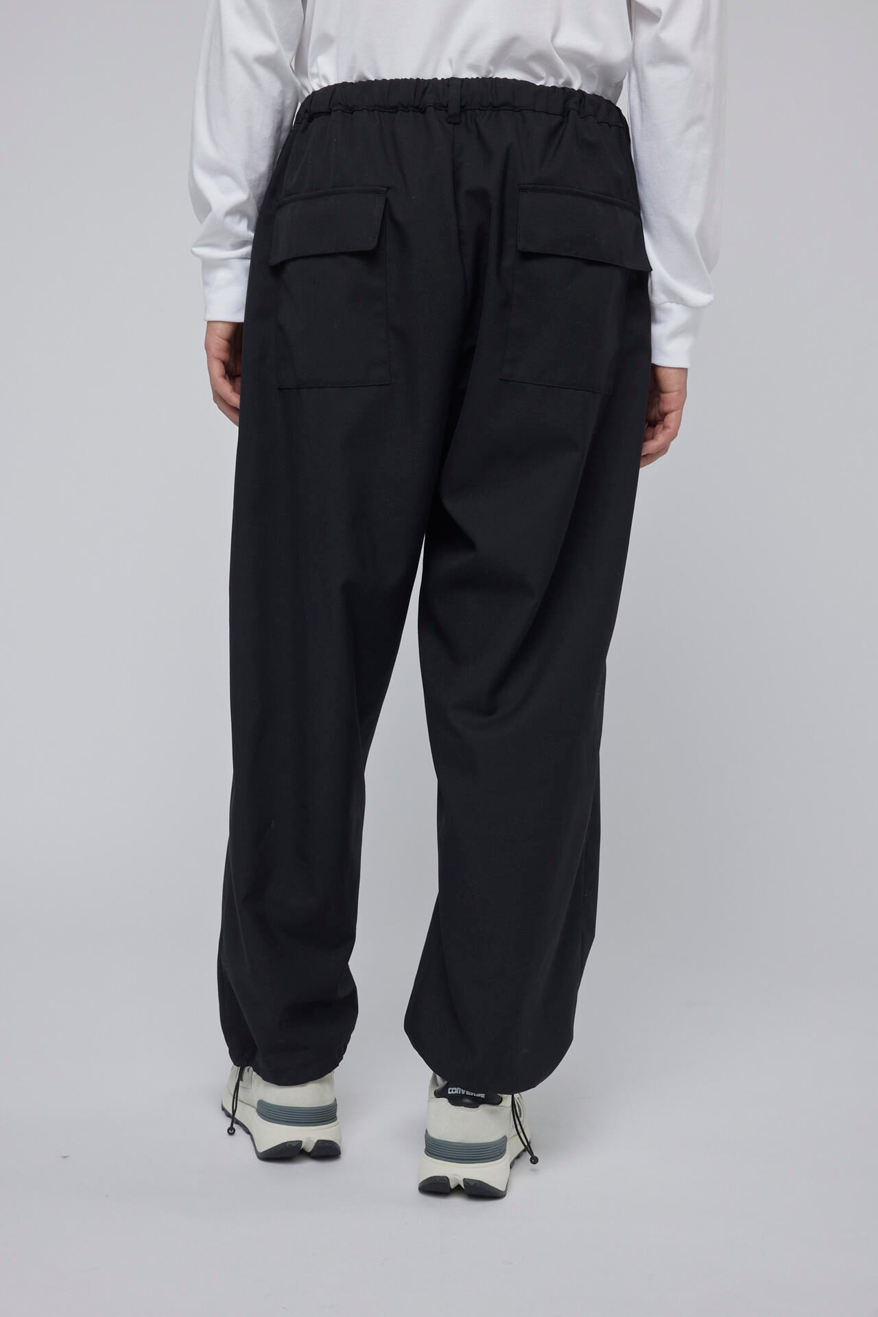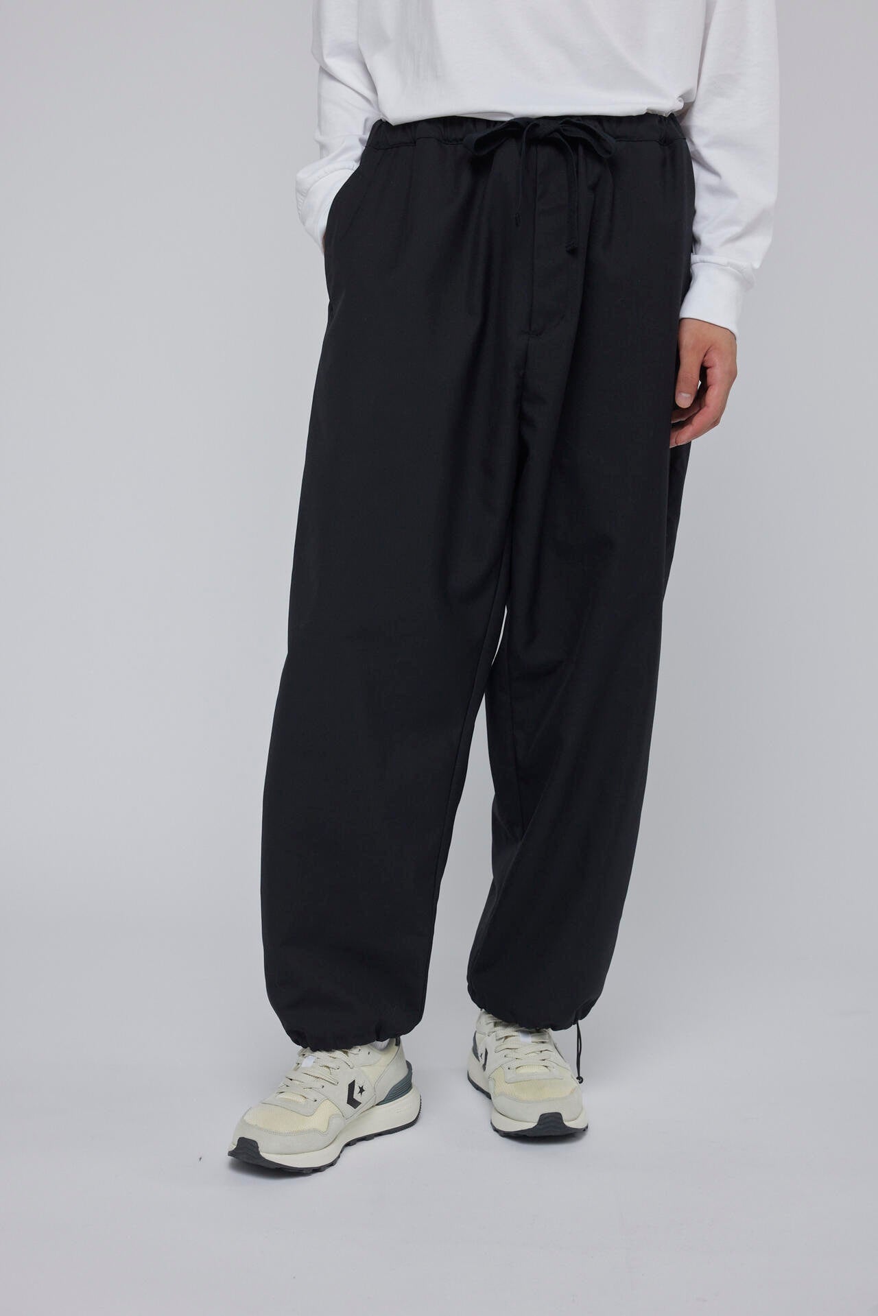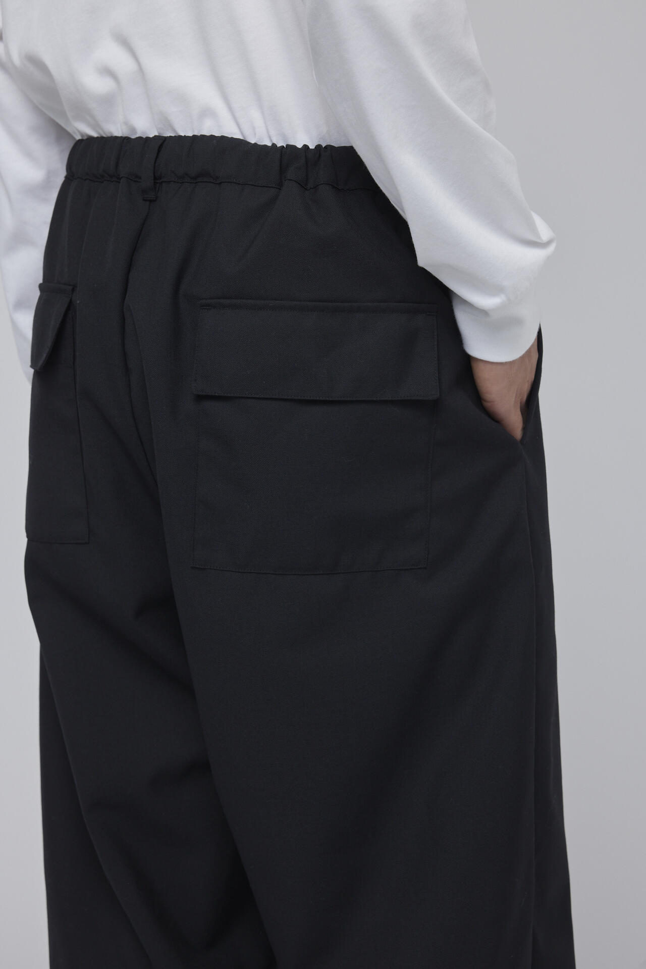 ウールポリエステルの混紡糸を使用し高密度に織ったウールギャバ素材を使用したイージーパンツ。