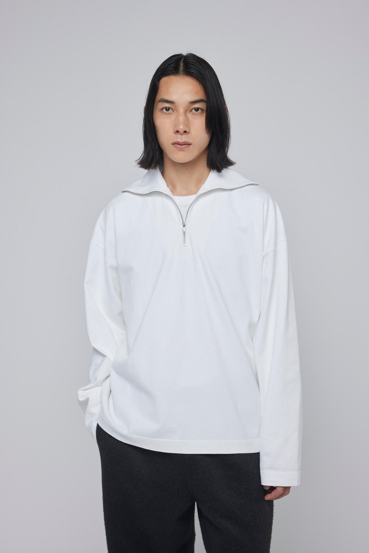 柔らかなヘビーオンスのジャージー素材を使用したハーフジップカットソー。