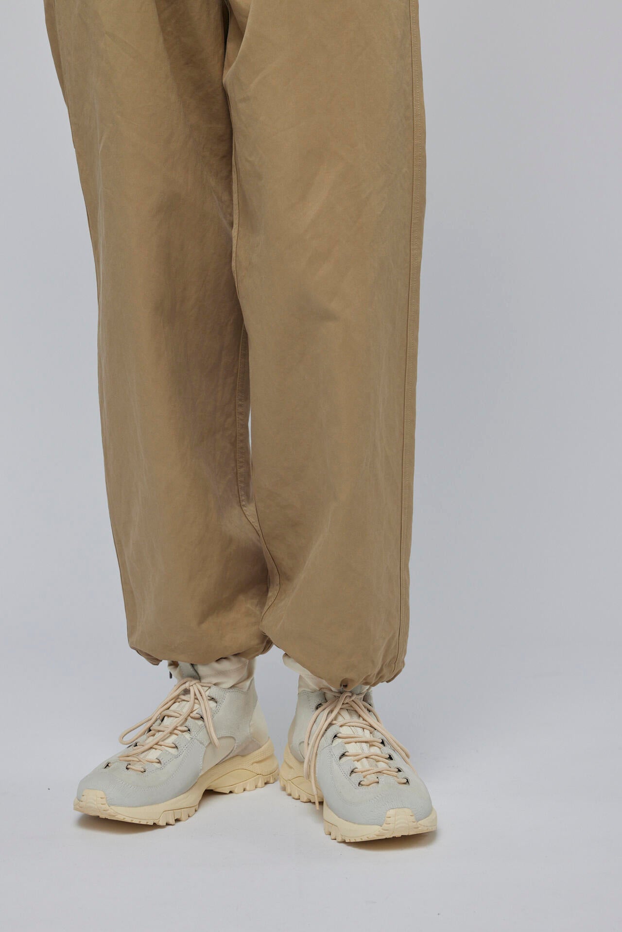 ラバー素材のトゥキャップと、滑らかなスエードとナイロンオックスがコンビのトレッキングシューズ。