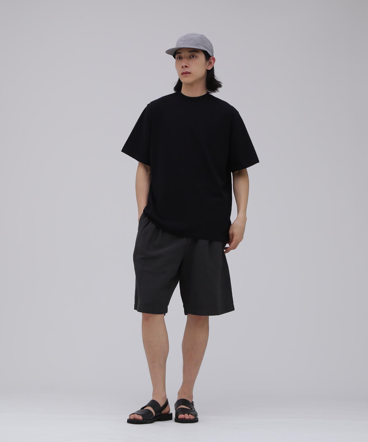 リラックス感ある雰囲気が特徴の2タックショーツです。タテにコットンの強燃糸、ヨコに細番手のリネン糸を使い織り上げたビエラ素材。コットンの強燃糸のサラッとしたタッチと、リネンのハリ感が特徴です。製品染めで、縮みも起きず、速乾性も兼ね備えています。前身は2タック、後ろ身はイージー仕様になっており、紐もベルト内側に通っているので、表に紐を出さず調節して着用が可能です。