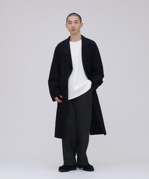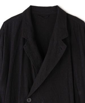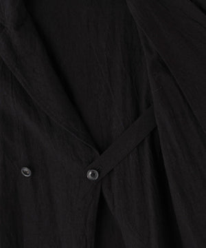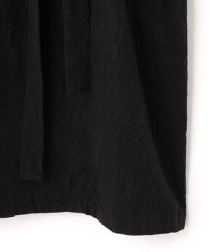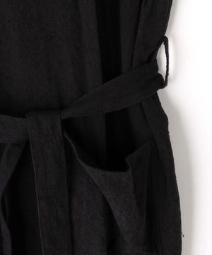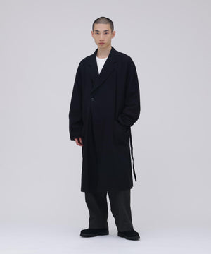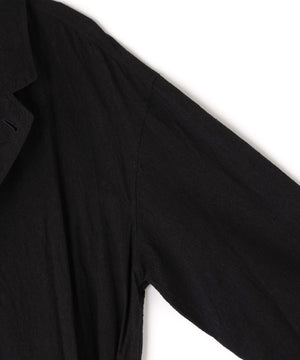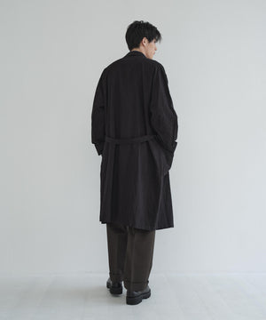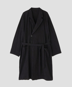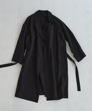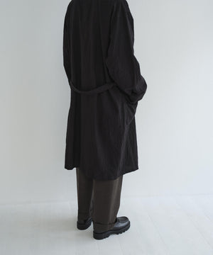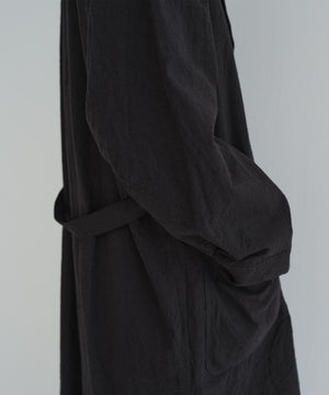 コットンとシルクノイルを織り交ぜた別注素材のシンプルなガウンコート。表面のフシやネップが特徴的なざっくりとした風合いの中にシルクの柔らかさを感じられる仕上がり。