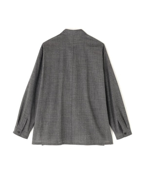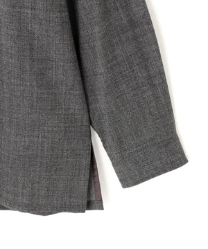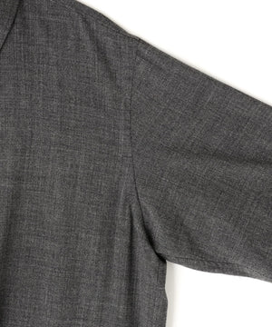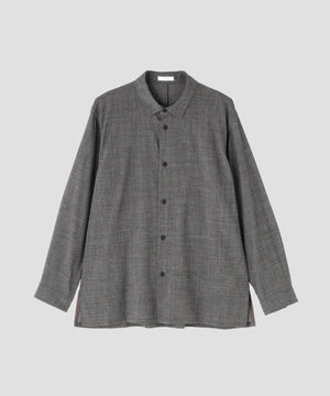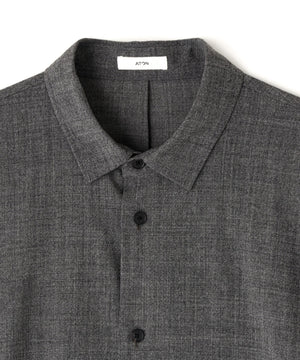 細番手の強燃糸をやや甘めに織り上げたウール素材に、起毛とワッシャー加工を施したシャツ。肌離れがよくシワになりづらい、ナチュラルストレッチ性があるATONのオリジナル素材。オーバーサイズのリラックスシルエット、カーディガンのように軽い着心地が特徴です。アームホールにあえて太めの折伏せ縫いを採用し、肩回りのシルエットを作っています。脇のスリット部分は裏地で始末し、すっきりとした仕上がり。