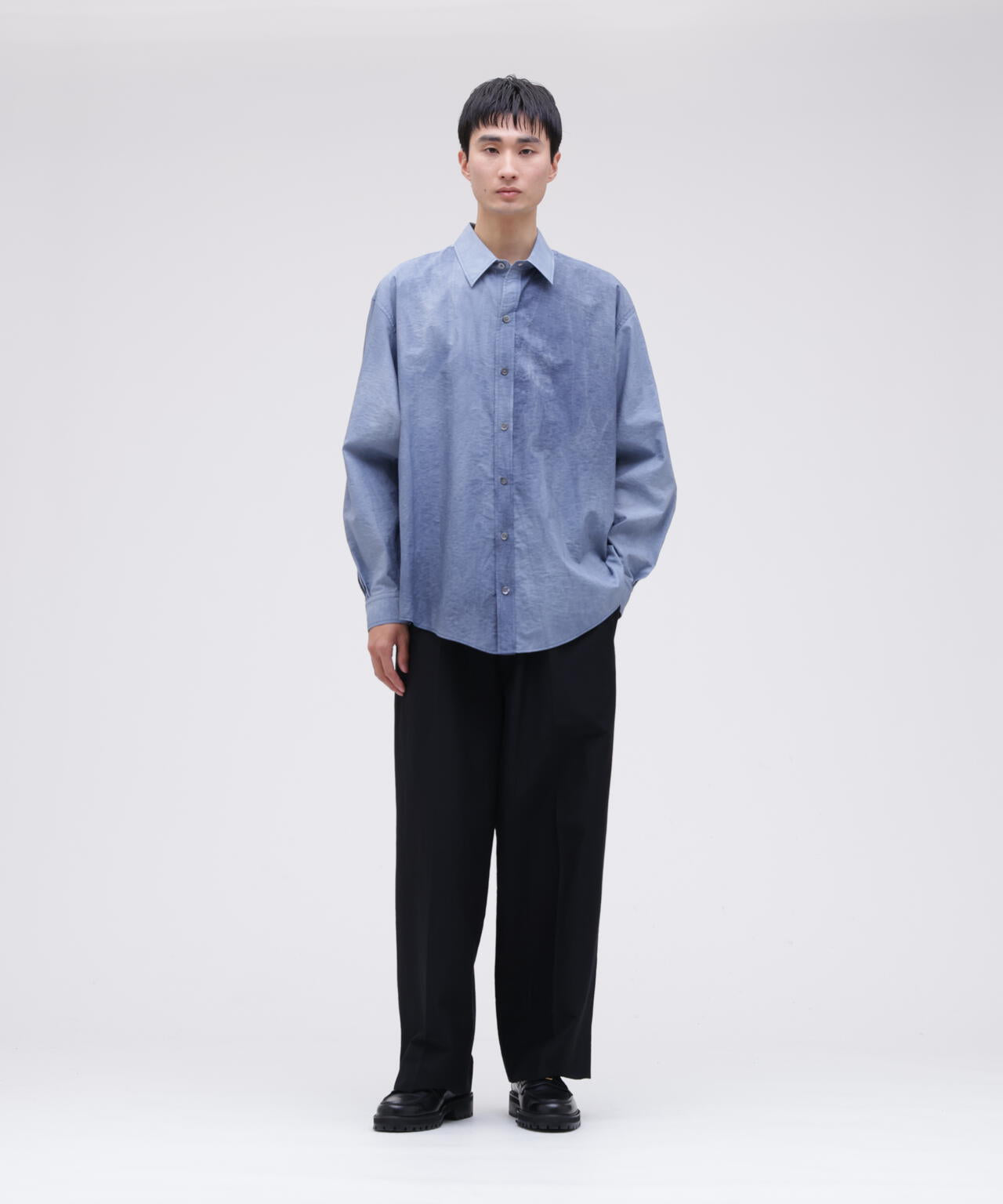 シルクと強撚ウール、コットンをあわせたツータックのワイドスラックス。ドライタッチで滑らかな肌触り、少し毛羽立った表面に仕上げています。ワッシャーでナチュラルなシワ、製品でさらに洗いをかけパッカリングを出した風合い豊かなアイテム。