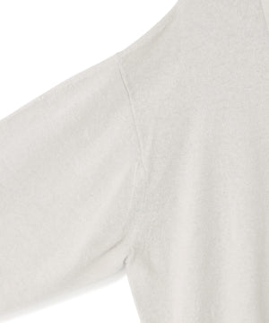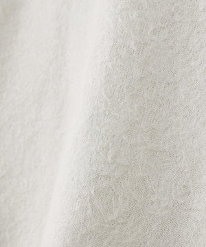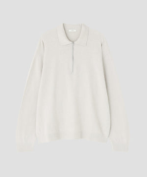 表側にリネンの糸を、裏側に強撚のコットンの糸を使用したニット素材です。新潟県にて、通常獣毛に使われるファー加工をあえて表側のリネンのみに施すことで、表側のリネンの艶やかな表情と程よい毛足感、裏側のさらっとしたコットンの強撚の着心地を兼ね備えたオリジナル素材です。程よいリラックス感が特徴のジップアップポロセーターです。天竺14ゲージを採用し、度詰めでしっかりとした着心地に仕上げました。裾リブが締まりすぎておらず、カットソーのようなシルエットを採用しています。