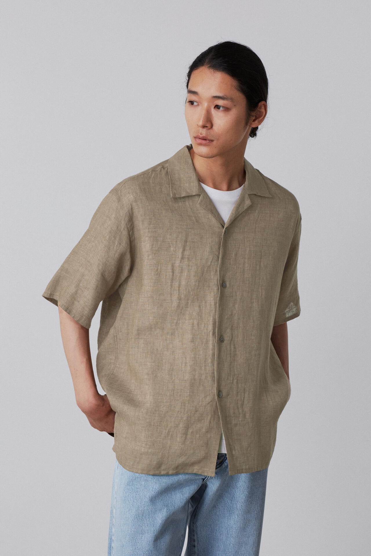 細番手のリネンを使い特殊なムラ染めをして、洗い晒したような感じと独特の落ち感と軽さを表現しています。ゆったりとした半袖シャツです。
