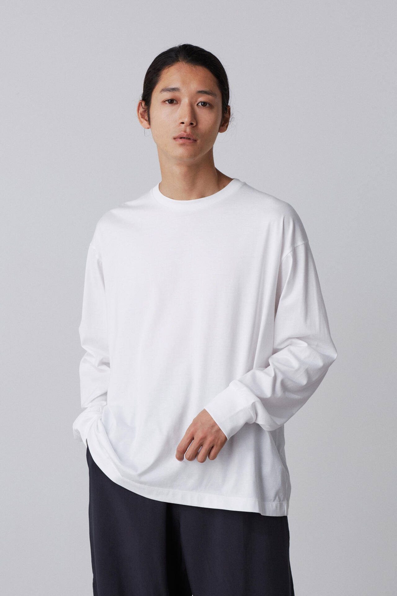 超長綿のスヴィンコットンを使用した綺麗な天竺のカットソーです。袖リブが太めなので、たくし仕上げると袖のシルエットが作れます。
