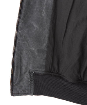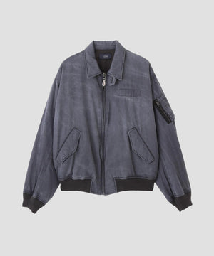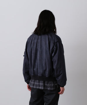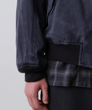経糸レーヨン、緯糸に綿のツイル生地に弱シルケットを掛け、顔料染めをした生地です。更に顔料をコーティングして、製品加工でヴィンテージ感を出しました。本格的なタンカースジャケットとフライトジャケットを組み合わせたデザイン。ショート丈に仕上げています。製品加工のため、個体差があります。