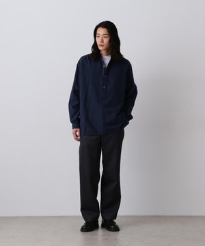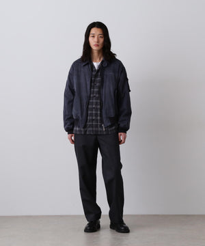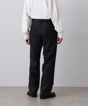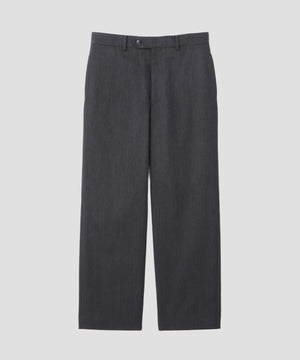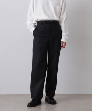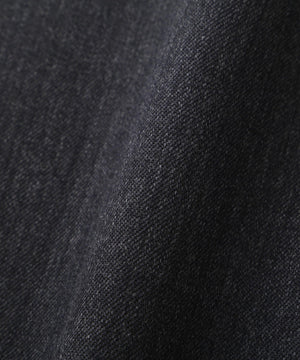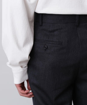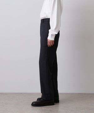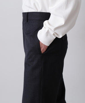 緯糸モヘア50%原料の糸を使用したモヘアならではの光沢感と自然なハリコシのあるギャバ。90sをイメージしたノータックの腰履きトラウザーです。