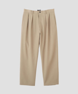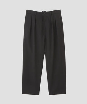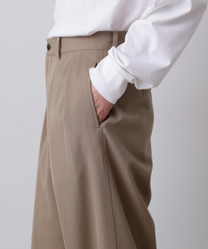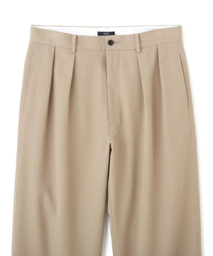 梳毛ウールのツイルを加工によって張り感ある風合いに仕上げています。ストレートシルエットの2タックトラウザーです。
