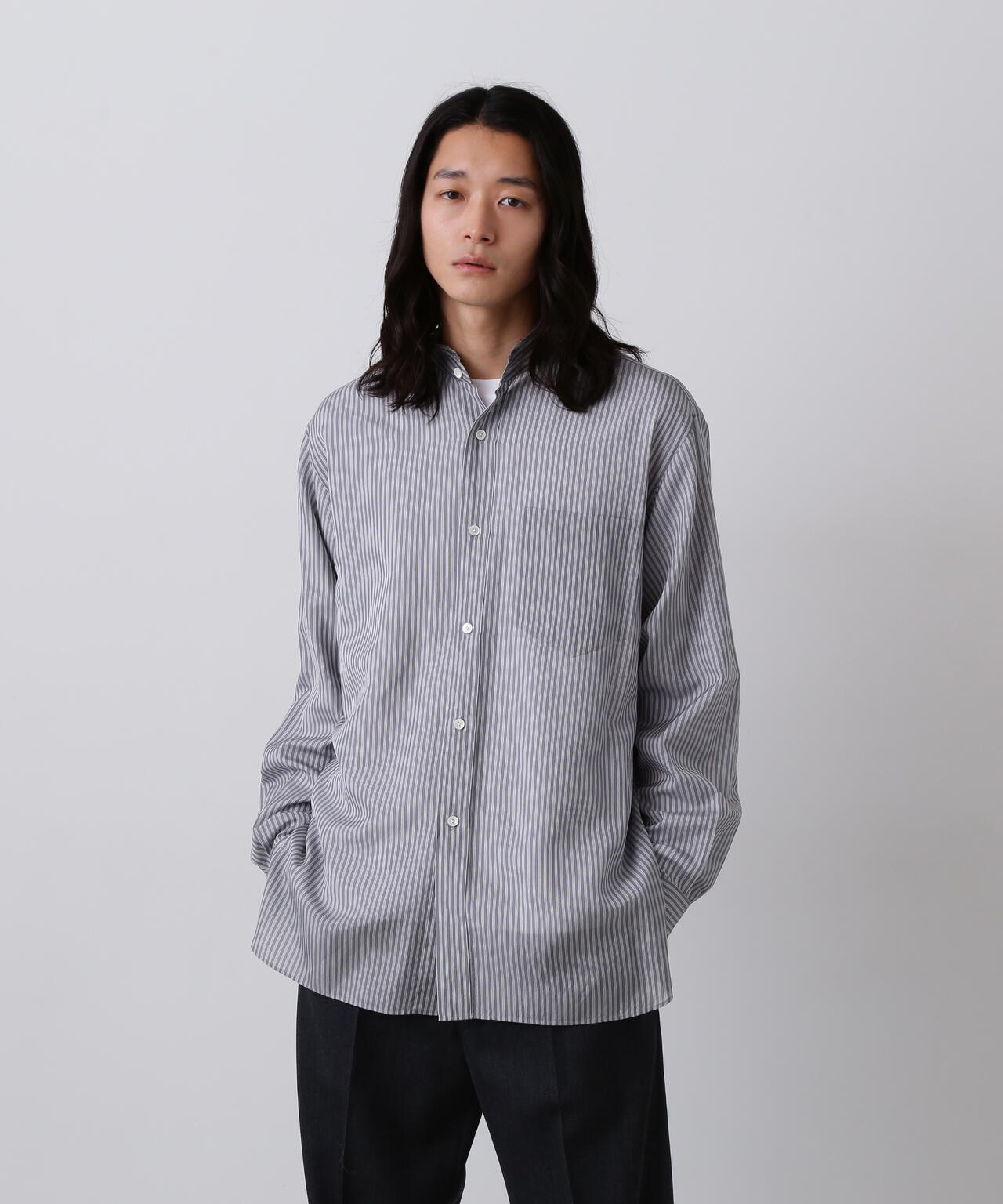 タテ糸にアセテートを追撚して使用し、ヨコ糸にはキュプラを打ち込んだ先染めストライプ生地を使用。追撚によって生まれる、柔らかくもシャリ感のある風合いが特徴です。ゆったりとしたシルエットのバンドカラーシャツに仕立てました。