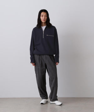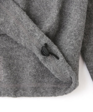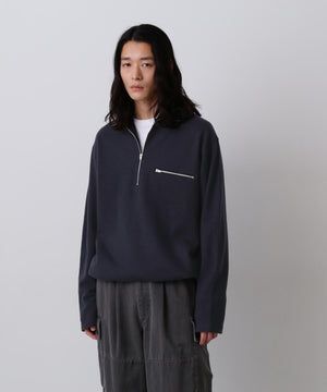 17.5μのオーストラリア産極細メリノウールを強縮絨させてカットソーの様に作った素材。カットソー感覚で着れる肌あたりの良いハーフジップデザイン。ジップの明け具合でレイヤードを楽しめます。