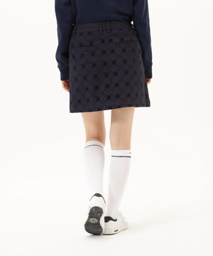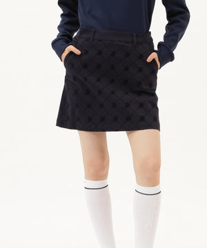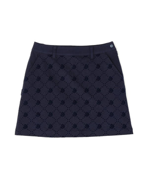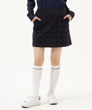 よく見るとモノグラム柄が見える、フロッキーツイルスカート。