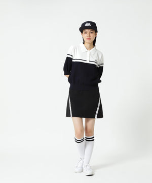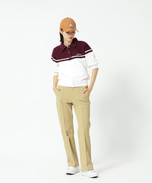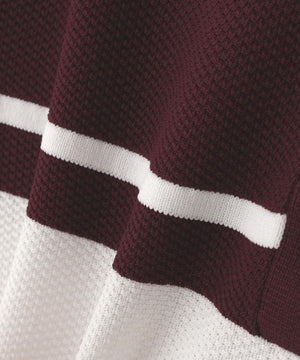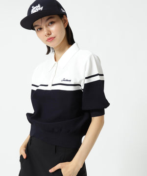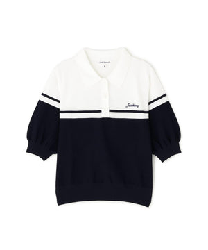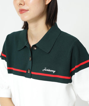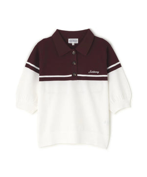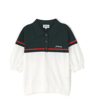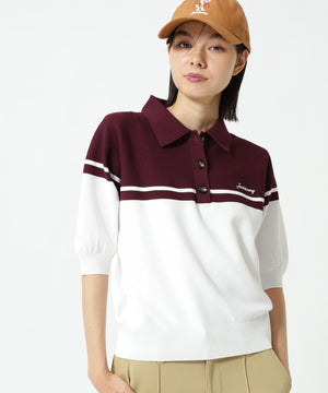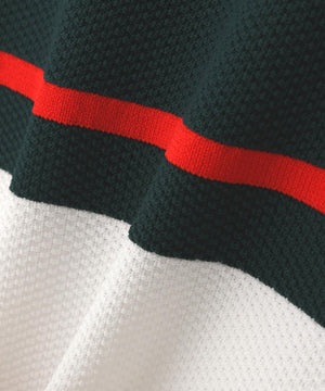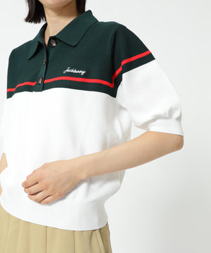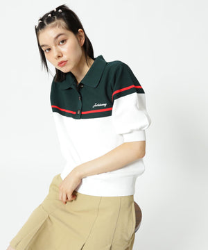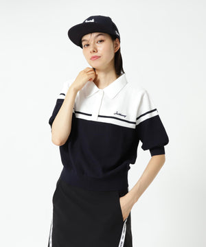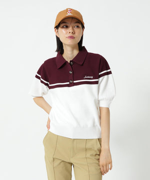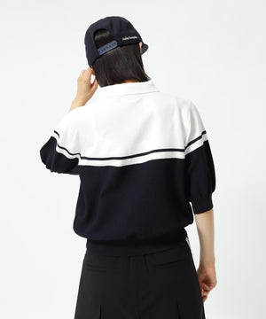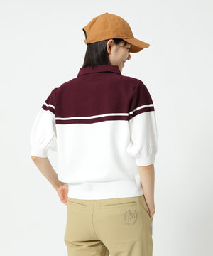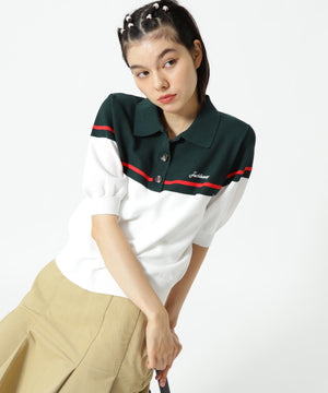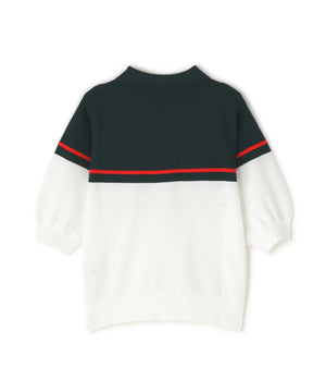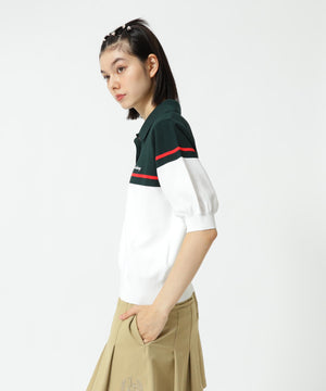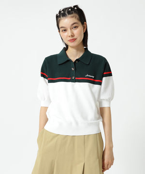 レトロスポーツなムードのあるパネル配色がポイントの、PE半袖ニットポロシャツ。