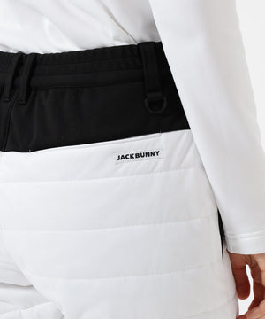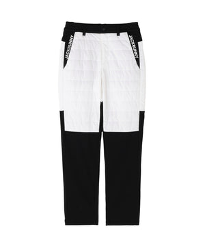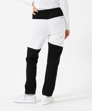 着膨れしにくい薄い中綿と防風機能の起毛カットソーをドッキングした、PEスムースラミネート中綿ロングパンツ。