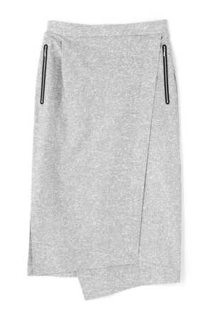 裾にスリットと段差をつけたヘムラインで足元に抜け感とこなれ感を与えた、杢グレーのデニットスカート。ラップ調のディテールでアシンメトリーにデザインした、穿くだけでオシャレになるトレンド感のあるスカートです。大人に似合うリゾートスタイルにもピッタリな、デニットの独特な素材感で魅力的に表現しています。白のクリアさが際立つ杢グレーの選び抜かれた素材と絶妙なカッティングで生み出された、心地よい着心地とシルエットの美しい一着。特殊編み立てによる凹凸感で清涼感を出したエアリーな素材は肌に心地よく、嵩高性や生地に膨らみを出すことで風合いをより柔らかに仕上げています。長めに垂らしたファスナーのスライダーテープがアクセントになって、タイトなシルエットの中で華やかさを演出しています。