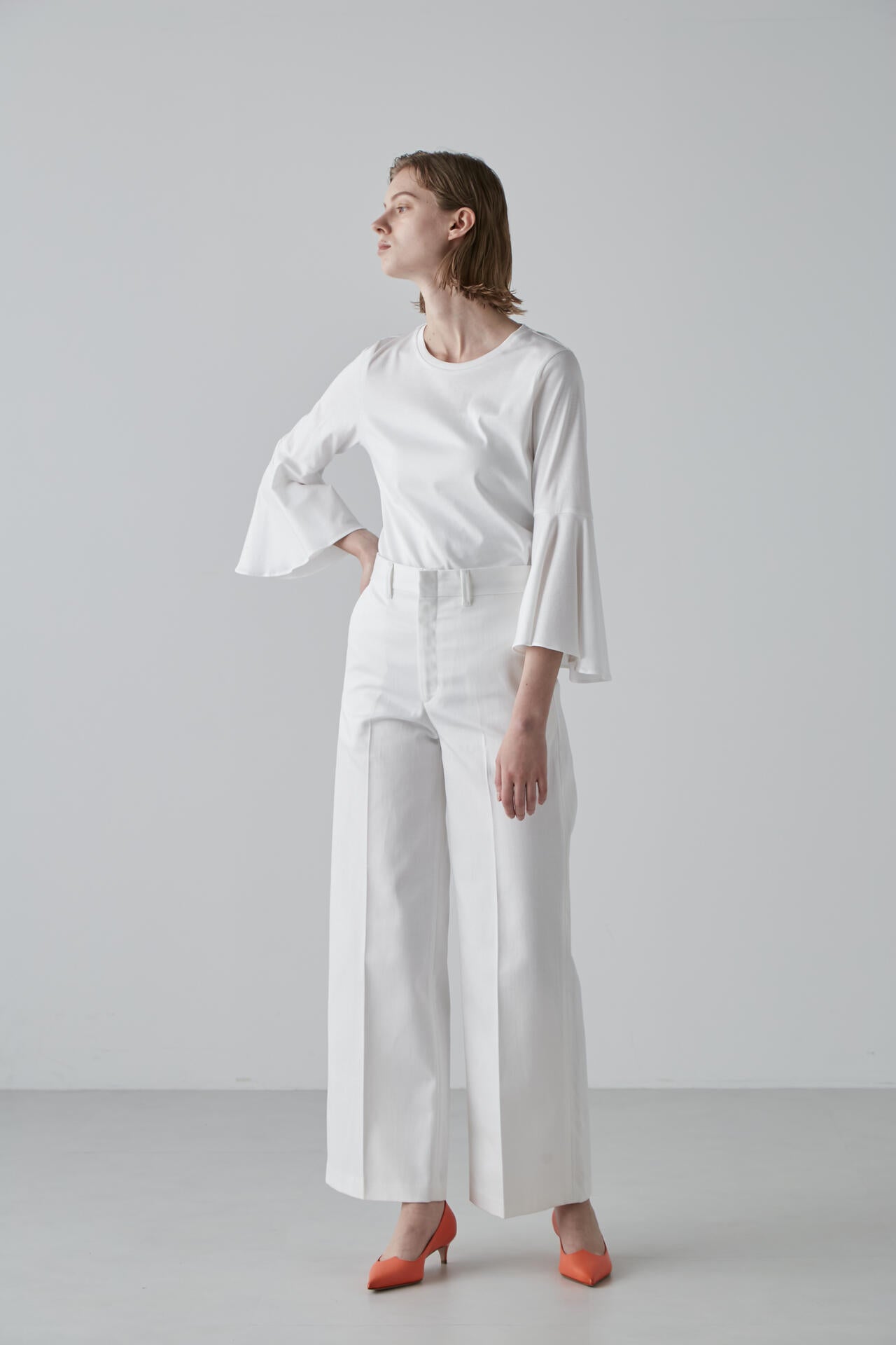 SERGEの中で、クラシックトラウザーズのセミフレアモデルを選び、オンオフどちらにも使える1着に。